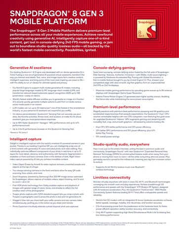 Mobile Gamer werden sich abseits der deutlich gestiegenen Performance über 8K- (mit externen Displays) oder 240 fps Gaming freuen, zudem werden die Unreal Engine 5 und die Adreno Frame Motion 2.0 Engine unterstützt, welche die Framerate bei gleichem Stromverbrauch verdoppeln kann. Laut Qualcomm werden Smartphones mit dem Snapdragon 8 Gen 3 bereits "in den kommenden Wochen" enthüllt, genannt werden explizit die Hersteller Asus, Honor, iQOO, Meizu, Nio, Nubia, OnePlus, Oppo, Realme, Redmi, RedMagic, Sony, Vivo, Xiaomi sowie ZTE.
