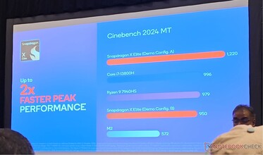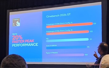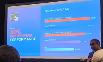 Anhand von Geekbench demonstrierte Qualcomm dabei die Peak-Performance. Die 80-Watt-Version des Snapdragon X Elite hatte dabei insbesondere im Single-Core-Vergleich deutlich die Nase vorne, aber auch die 23-Watt-Variante lag immer noch leicht vor der versammelten Konkurrenz. Auch bei Last auf allen Kernen schnitt der Snapdragon gut ab, auch wenn der Intel-Prozessor hier etwas schneller war als die 23-Watt-Version.