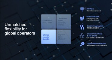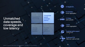 Erstmals ermöglicht Qualcomm im Snapdragon X70-Modem eine 4x Carrier Aggregation beim Download und zwar über Sub-6, mmWave sowie TDD und FDD-Netze hinweg. Auch beim Upload ins Netz erhöht sich die maximale Bandbreite dank der Kombination mehrerer Frequenzblöcke auf nunmehr 3,5 Gbps, mit der Ultra-Low-Latency-Suite können Mobilfunkprovider und Hardware-Hersteller ihre Geräte und Netze auf niedrigere Latenzen hin optimieren.
