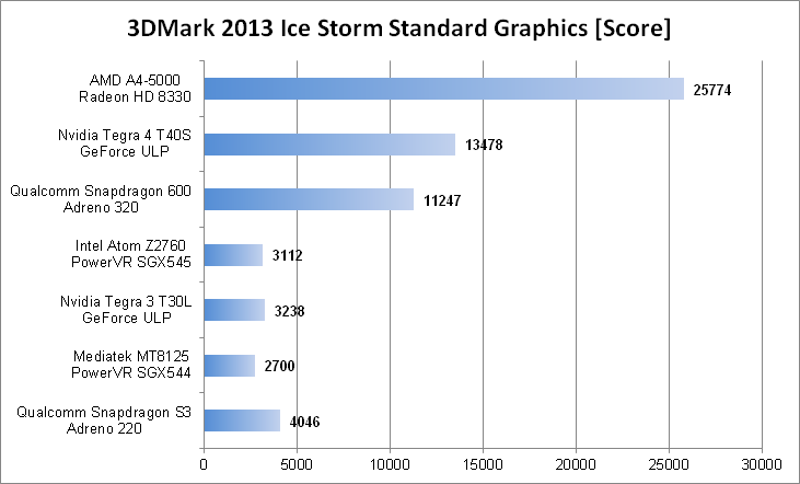 Ebenfalls nur bedingt überzeugen kann die Leistung von Tegra 4. Gegenüber dem Snapdragon 600 steht Nvidias High-End-SoC zwar recht gut da, doch vergleichen wir hier Smartphone und Tablet miteinander. In Anbetracht der weitaus höheren Leistungsaufnahme könnte man noch einen etwas deutlicheren Unterschied erwarten. Unangefochtene Nummer eins in allen drei Benchmarks ist die Radeon HD 8330 des AMD A4-5000, welche rund doppelt so schnell wie der stärkste Verfolger rechnet. Ein Ultrabook mit Haswell-Prozessor und HD Graphics 4400 würde sogar die drei- bis vierfache Performance erreichen.