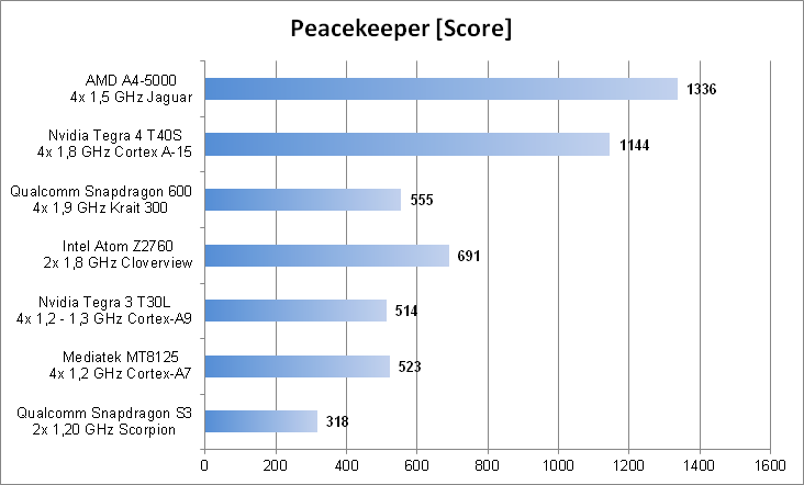 Beeindruckend ist der Vorsprung, den der Cortex-A15-basierte Tegra 4 auf alle anderen ARM-SoCs herausholt. In einigen Tests kann sich die Performance sogar mit dem A4-5000 messen – selbst wenn man die 20 Prozent höhere Taktrate herausrechnet, ist die resultierende Pro-MHz-Leistung für ein ARM-Design bemerkenswert. Dabei darf man jedoch nicht vergessen, dass der Cortex-A15 wohl auch in puncto Leistungsaufnahme nicht mehr weit hinter den Jaguar-Kernen von AMD liegt: Wie im Test des Toshiba Excite Pro nachzulesen, beginnt Tegra 4 unter Volllast bereits nach kurzer Zeit zu throtteln – Nvidias Shield-Konsole (die eine noch etwas höher taktende Version des Chips integriert) kommt deshalb nicht ohne Grund mit aktiver Kühlung daher.