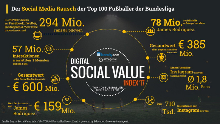 Die Hamburger Education Gateway GmbH hat gemeinsam mit almagenic eine umfassende Studie zur Performance und zum kommerziellen Wert der Social-Media-Accounts der 100 wertvollsten Bundesliga Fußball-Profis erstellt. Die Studie zeigt, welchen enormen kommerziellen Wert die Social-Media-Aktivitäten der Fußballer besitzen und welche Spieler auch digital besonders gut im Geschäft sind.