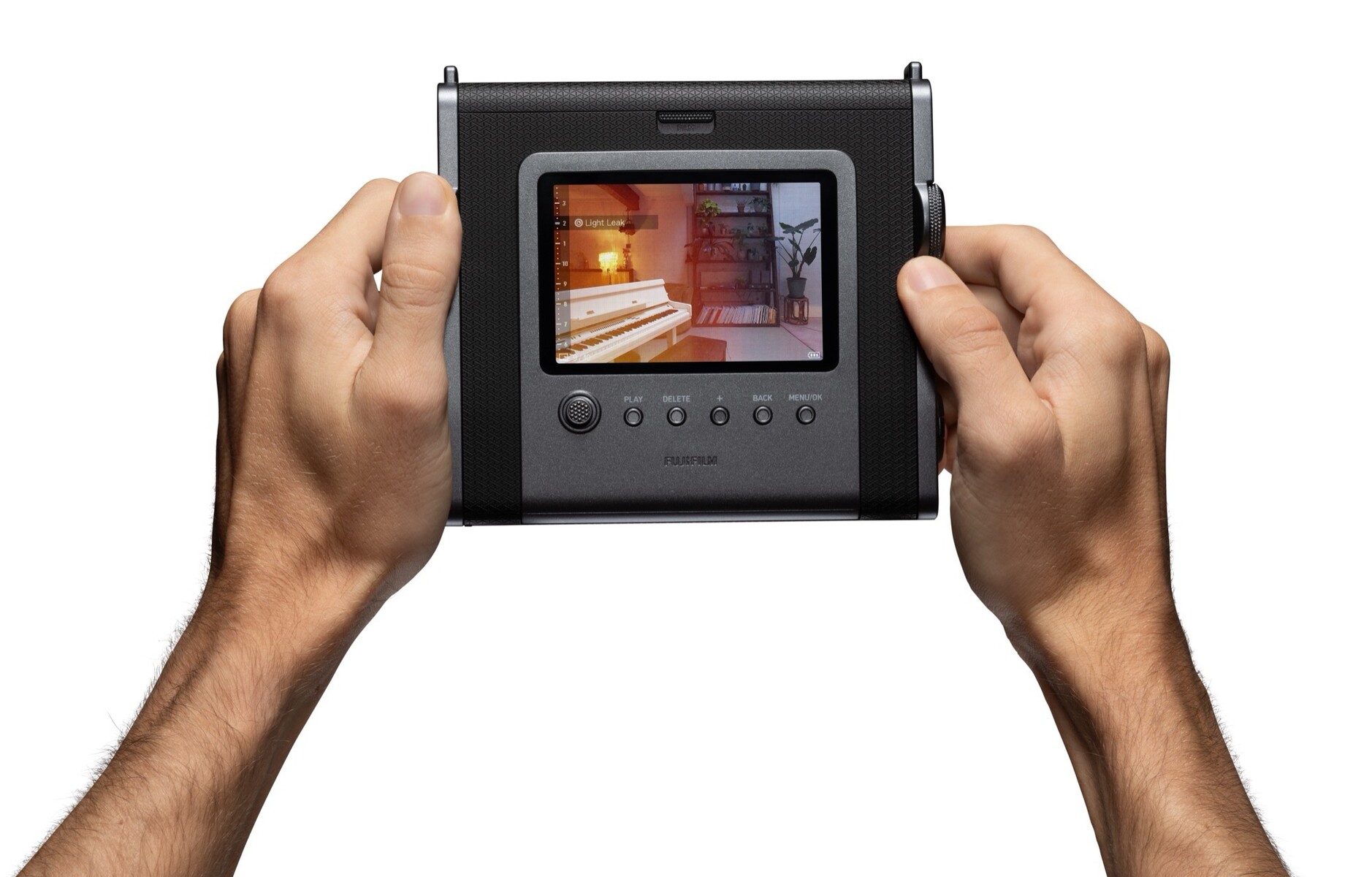 Passend dazu besitzt die Kamera ein 3,5 Zoll Display im Querformat auf der Rückseite, welches dem ansonsten recht klassisch gestaltetem Design einen moderneren Look verleiht. Die Kamera besitzt ein Ultraweitwinkel-Objektiv mit einer Kleinbild-äquivalenten Brennweite von 16 mm, allerdings mit der Option, die Brennweite durch einen Schieberegler zu verlängern. Eine Besonderheit ist die ausklappbare Kurbel an der Seite des Gehäuses, welche gedreht wird, um ein bereits aufgenommenes Foto zu drucken.