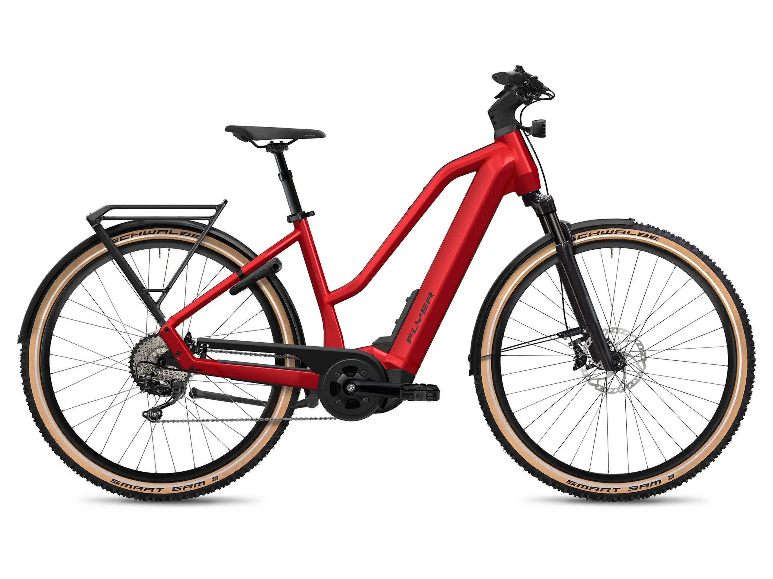 Verbaut ist eine Federgabel mit einem Federweg von 75 Millimetern, wie für ein Trekking-E-Bike typisch, fehlt ein Dämpfer. Vorne und hinten kommen hydraulische Shimano-Scheibenbremsen mit jeweils zwei Bremskolben und 180 Millimeter großen Bremsscheiben zum Einsatz. Ein Fahrradständer, Schutzbleche, eine Beleuchtung und ein Gepäckträger zählen zur Ausstattung. Ein Rahmenschloss ist ebenfalls vorhanden. Als Gewicht werden mindestens 32 Kilogramm angegeben.