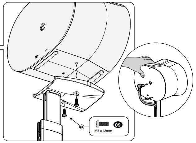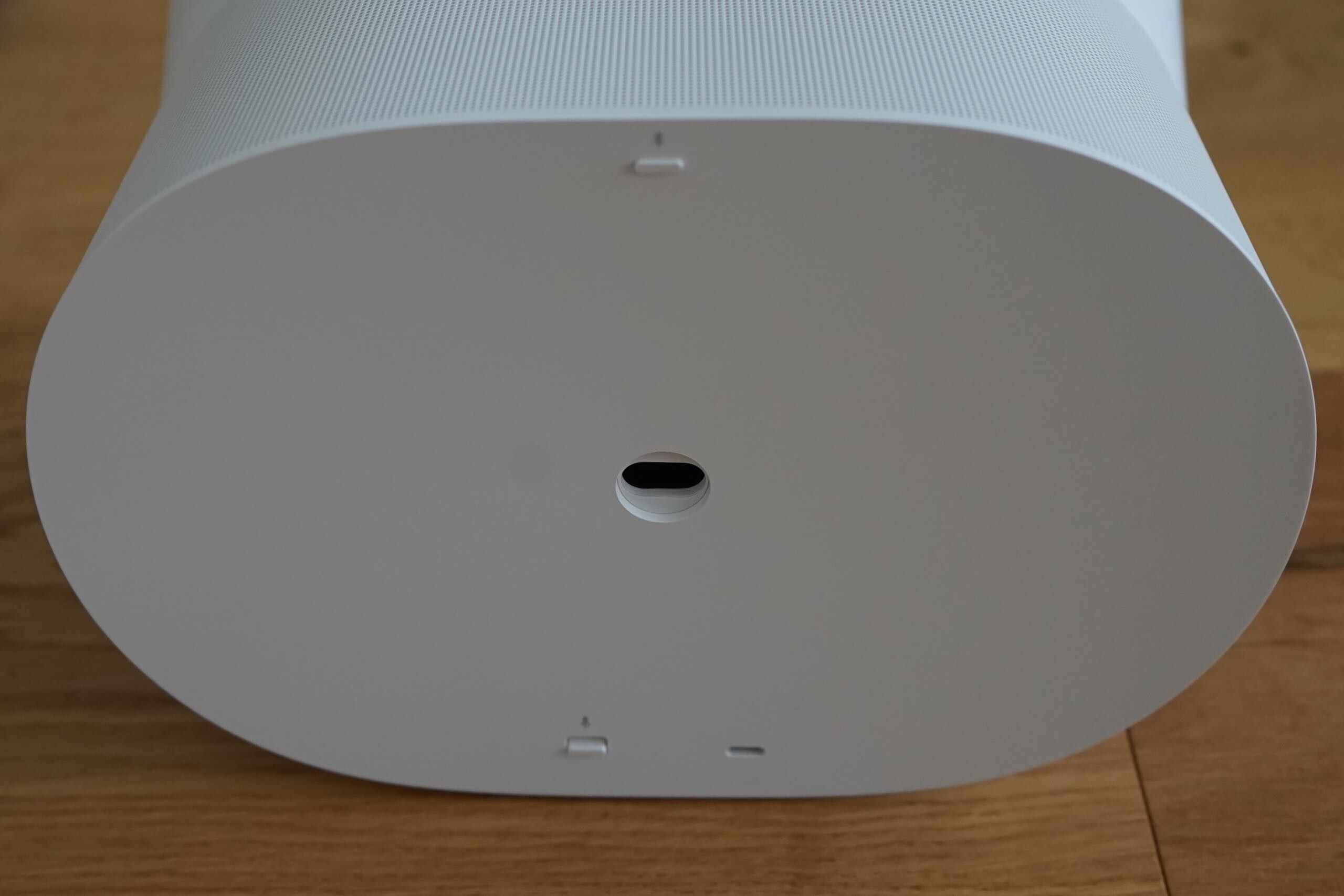 Als Smartspeaker setzt Sonos hauptsächlich auf die drahtlosen Verbindungsmöglichkeiten via Bluetooth 5.0 oder Wi-Fi 6. Bei den physischen Eingängen sieht es jedoch etwas mickrig aus, hier bietet Sonos nur einen proprietären USB-C Eingang, der per teuren Sonos Adapter für Ethernet oder AUX-Eingang genutzt werden kann. Leider weist der Line-in einen deutlichen Zeitversatz von mindestens 75ms auf. Der Speaker integriert ein Netzteil und daher ist nur der formschöne und platzsparende abgewinkelte Netzstecker notwendig. Einen Akku besitzt der Era 300 nicht und da der USB-C Port auch kein Power-Delivery unterstützt, gibt es auch keine Option für eine Powerbanknutzung. Auf der Unterseite gibt es leider auch kein Schraubloch für ein Stativgewinde. Sonos nutzt hier zwei Schraublöcher für M5 x 12mm Schrauben für die eigenen und teuren Standfüße.