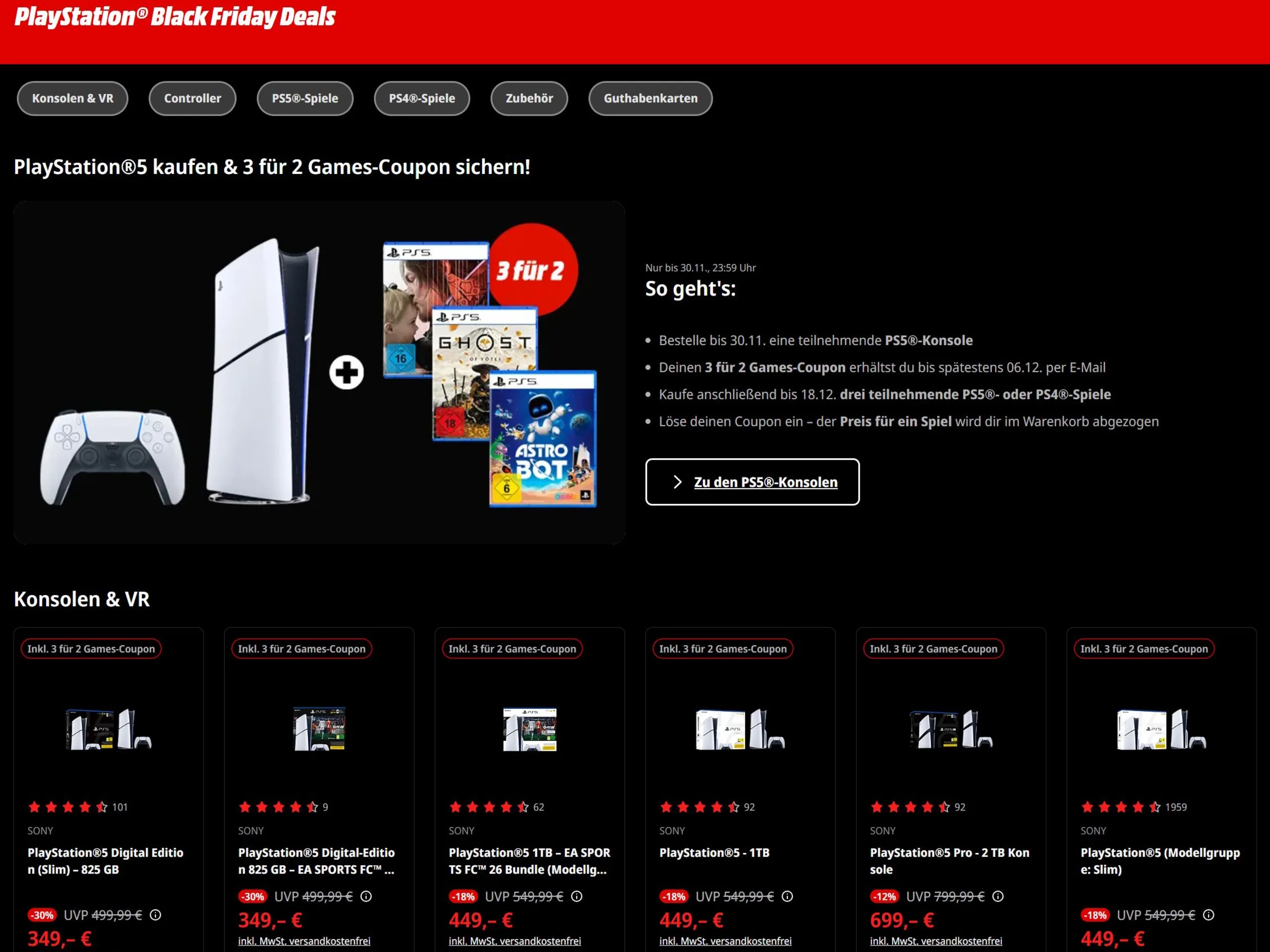 Interessant ist in diesem Zusammenhang auch der 3 für 2 Games Coupon: Wer bis zum 30.11. eine der Konsolen kauft, bekommt per Mail den Coupon und hat bis zum 18.11. Zeit ihn einzulösen. Wer in diesem Zeitraum drei PS5- oder PS4-Spiele kauft, muss nur 2 bezahlen. Eventuell ist die Spielauswahl dabei begrenzt, denn es ist von "teilnehmenden Spielen" die Rede.