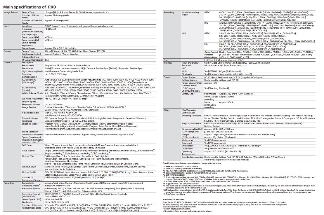 Überraschend ist auch, dass das Datenblatt (siehe unten) keine 4K-Recording-Modi anführt. Bei der Yi-4k+ Actioncam sind da beispielsweise 60 fps möglich, Sony kann 4K-Aufnahmen zwar direkt und unkomprimiert an den HDMI-Ausgang ausgeben, eine interne Aufnahme scheint aber nicht vorgesehen zu sein. Im Zusammenspiel mit mehreren RX0-Cams erlaubt Sony umfangreiche Steuerungsmöglichkeiten um beispielsweise VR-Aufnahmen zu erstellen. Schade, dass der Hersteller beim USB-Port nach wie vor auf das veraltete Micro-USB und USB 2.0 setzt. Auch das integrierte WLAN ist auf den 2,4 Ghz-Bereich beschränkt. Das rückseitige 1,5 Zoll-Display ist nicht touch-fähig, Sony setzt nach wie vor auf Hardware-Buttons. Die RX0 soll ab Oktober um stolze 850 Euro erhältlich sein, ein großes Zubehörprogramm steht dann ebenfalls zur Verfügung.