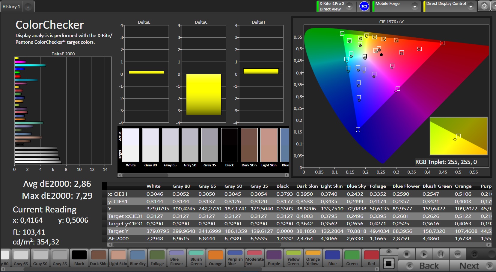 | Delta E Colorchecker * | 2.86 | 0.9 69% | 0.68 76% | 1.1 62% | 4.5 -57% | 1.4 51% |