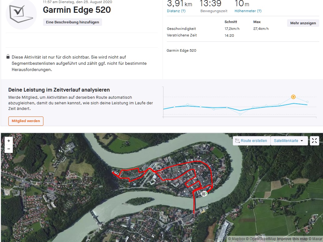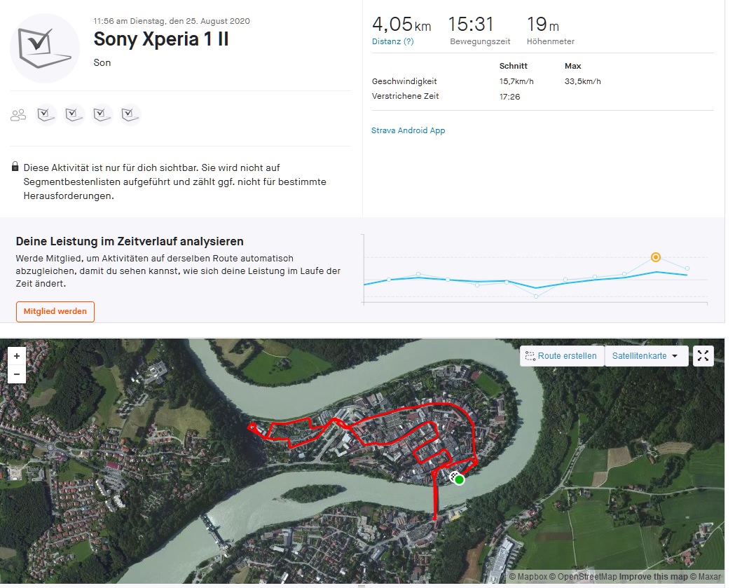 Auf unserer obligatorischen Fahrradtour zeigt sich das Xperia 1 II mit einer ähnlichen Genauigkeit wie unser Referenzgerät Garmin Edge 520, wobei es gelegentlich zu abgeschnittenen Kurvenverläufen kam. Für einfache Navigationsaufgaben ist das Sony-Smartphone aber durchaus geeignet.