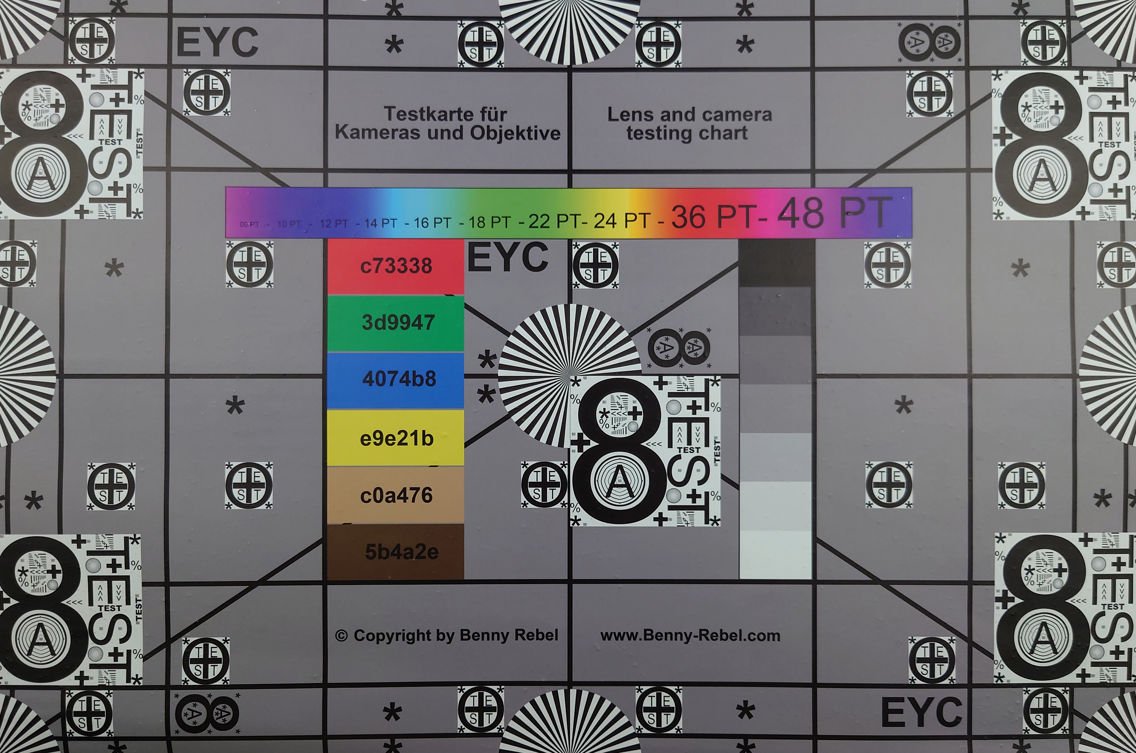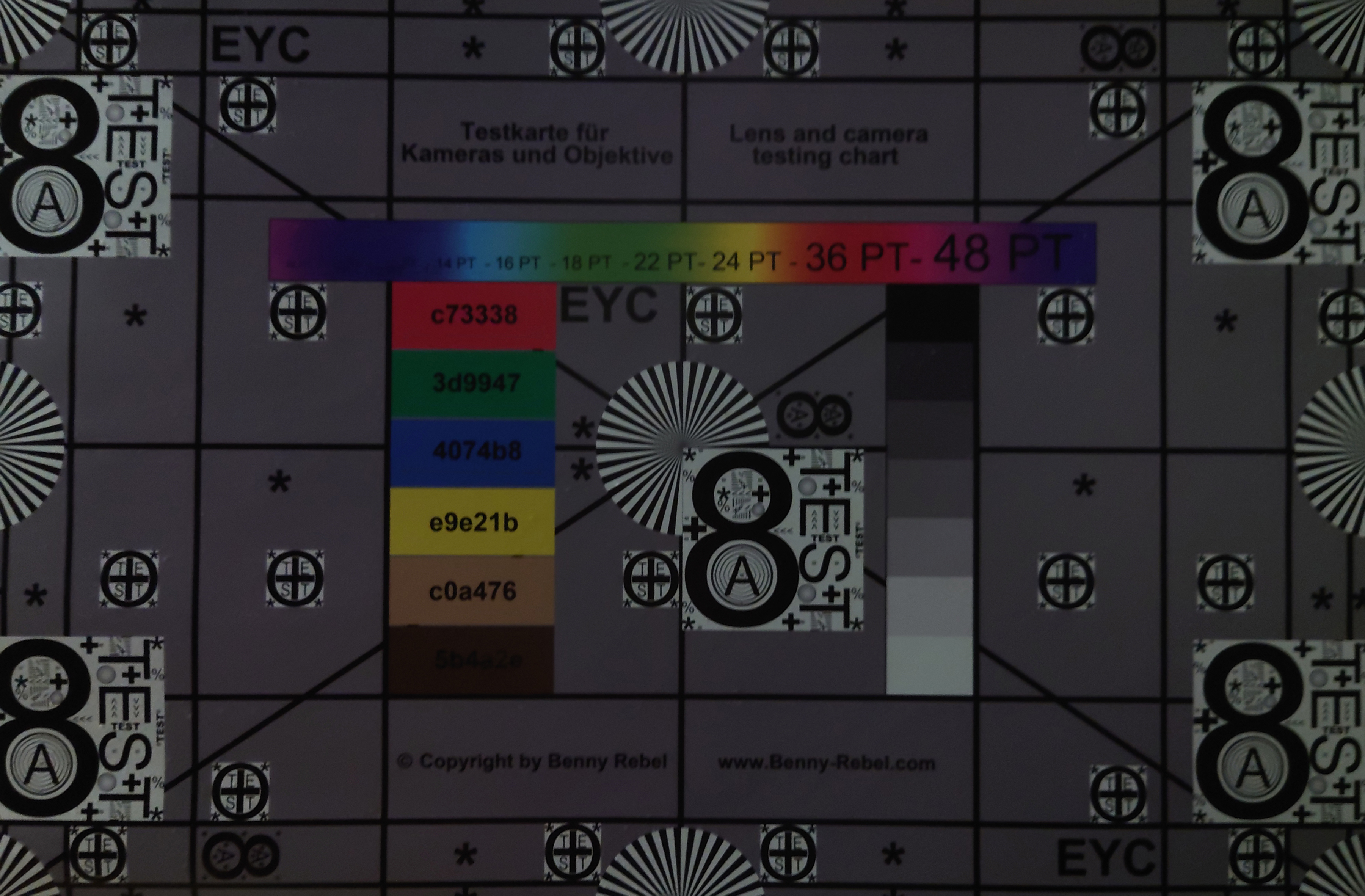 Bei schlechten Lichtbedingungen bleiben sowohl der Testchart als auch der ColorChecker Passport noch zu erkennen. Farben wirken allerdings deutlich dunkler und Details sind unscharf.