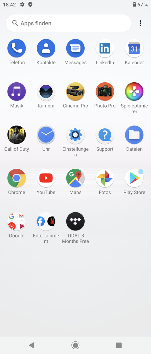 Nutzer blicken nach dem Start des Sony Xperia 1 II auf ein Android-10-System mit Sicherheitsupdates auf dem Stand von 1. Juli 2020. Zum Zeitpunkt unseres Tests stand allerdings bereits ein Update bereit, mit dem die Patches auf den Stand vom 1. August 2020 angehoben wurden. Die Bedienoberfläche ähnelt nahezu vollständig der eines puren Android-Systems und Sony nimmt nur wenige Anpassungen im Einstellungsmenü vor. Neben den vorinstallierten Kamera-Apps "Cinema Pro" und "Photo Pro" finden sich auch Netflix, Facebook, LinkedIn, Call of Duty und eine Trial-Version von Tidal vorinstalliert. Diese lassen sich im Menü lediglich deaktivieren, aber nicht deinstallieren.