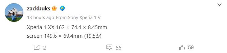 Laut dem in Sony-Kreisen sehr geschätzten Weibo-User Zackbuks (siehe auch Screenshot unten) wird das Xperia 1 VI in diesem Jahr 162 x 74,4 x 8,45 mm messen und damit 3 mm kürzer und 3,4 mm breiter als das Xperia 1 V mit 165 x 71 x 8,3 mm sein. Auch die Dicke erhöht sich minimal um 0,15 mm. Die Angaben wurden zwar noch nicht offiziell bestätigt, mittlerweile scheint allerdings kaum mehr ein Zweifel daran zu bestehen, dass die Gerüchte wahr sind.