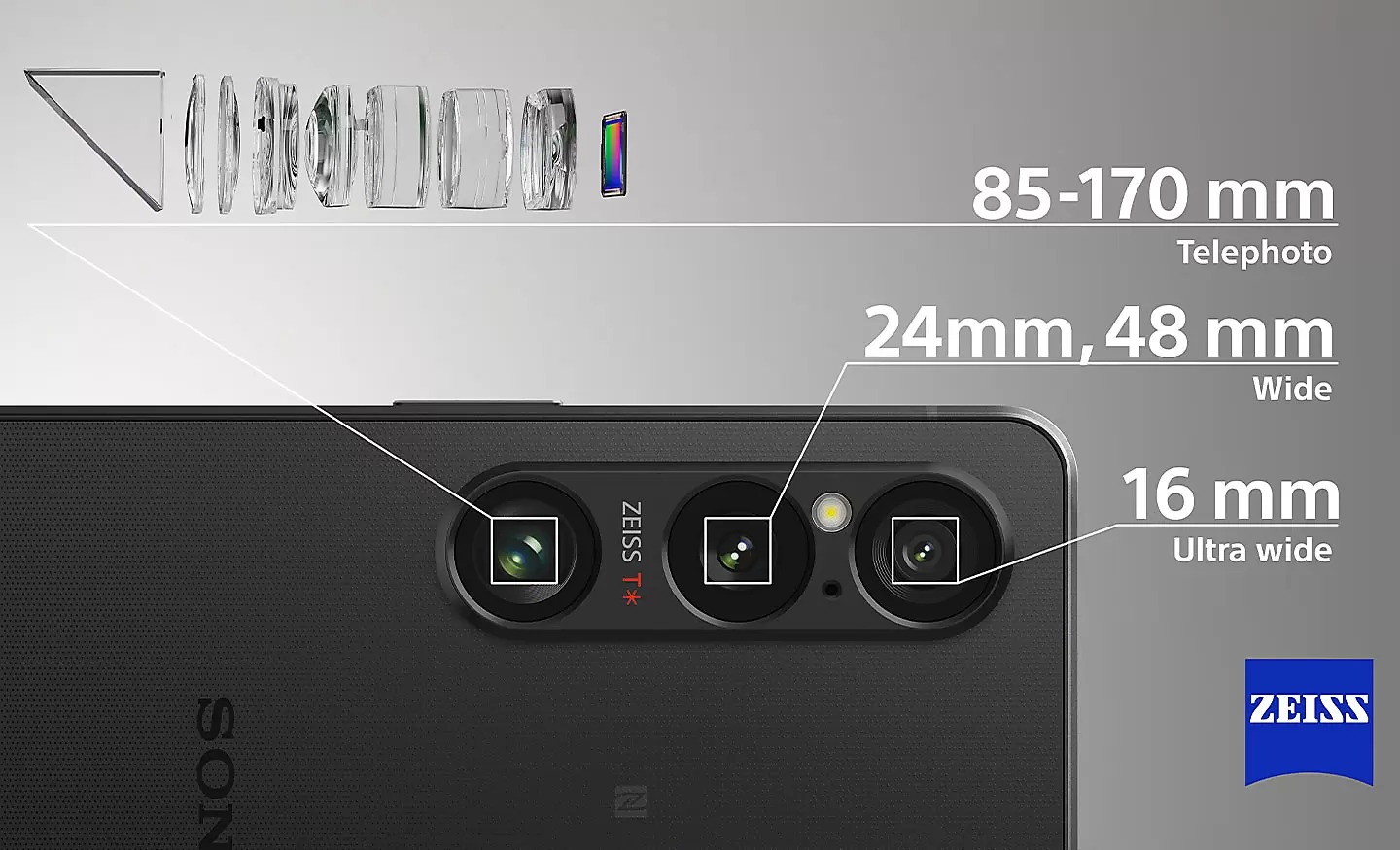 Die bietet nun einen erweiterten variablen Brennweitenbereich zwischen 85mm und 170mm äquivalent, also bis zu etwa 7,1x Zoom bei einer Blende zwischen F/2.3 und F/3.5. Beim Vorgänger endete die optische Reichweite bei 125mm und F/2.8. Dazu kommt, dass Sony mit dem 48 Megapixel-Sensor nun einen Crop-Zoom bei 48mm unterstützt, unverändert steht auch ein 16mm Ultraweitwinkel zur Verfügung, die Zeiss T* Beschichtung sorgt für möglichst artefaktfreie Bilder.