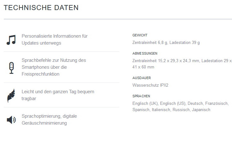 Die leichten, komfortablen Ohrstücke aus weichem Silikon sind für durchgehendes Tragen geeignet und gemäß IPX2 wasserdicht. Der 65-mAh-Akku reicht laut Sony für den ganzen Tag. Sony spendiert dem Xperia Ear eine Schutzhülle, die zugleich als Ladegerät (300 mAh) dient. Zum Aufladen wird der Ohrhörer einfach hineingelegt.