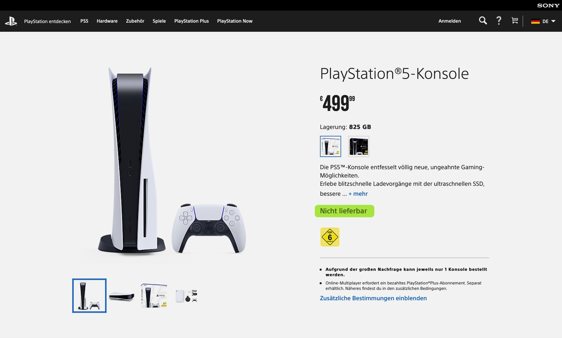 Der Onlineshop von Sony bietet jetzt die PlayStation 5 Digital Edition für 399,99 Euro an, die reguläre PS5 mit Disk-Laufwerk wird für 499,99 Euro angeboten. Aufgrund der hohen Nachfrage kann nur eine Konsole pro Kunde bestellt werden. Dieser Schritt ändert allerdings nichts an der knappen Verfügbarkeit der PlayStation 5, denn auch Sonys eigene Webseite listet die Konsole als "nicht lieferbar".
