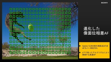 Dank der größeren Pixel soll die Sensitivität um 50 Prozent im Vergleich zum Vorjahres Xperia 1 erhöht worden sein, was bessere Nachtaufnahmen verspricht, dank der 10 ms schnellen Sensor-Readouts kann Sony zudem kontinuierliche Bursts mit 20 fps garantieren und das bei aktiviertem Autofokus-Tracking (AE, AF). Der Dual-Pixel Autofokus wird dabei vom 3D-TOF-Sensor unterstützt, der Bildprozessor Bionz X liefert 60 AE/AF-Berechnungen pro Sekunde. Auch Eye-AF ist wieder mit dabei und kann nun auch bei Tieren auf die Augen fokussieren - von den Alpha-Kameras kennen wir auch die vielen, hier konkret 247 Phase Detection-Punkte.