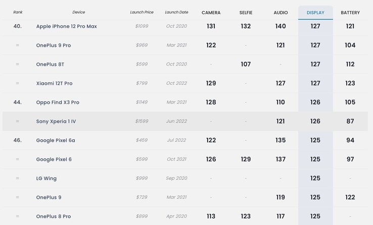 Das deckt sich mit den Erkenntnissen in unserem ausführlichen Testbericht, in dem wir selbst an der hellsten Stelle des Bildschirms nicht mehr als 907 Nits messen konnten. Wir mussten außerdem die relativ niedrige PWM-Frequenz von 161 bis 481 Hz kritisieren, während das hochauflösende Panel ohne dynamische Anpassung der Bildfrequenz mit für die relativ kurze Akkulaufzeit des Xperia 1 IV verantwortlich ist. DxOMark lobt zwar die flüssige Darstellung von Bewegungen, die hohe Farbtreue und die einwandfreie Anzeige von Videos und Spielen, mit einer Wertung von 126 Punkten reicht es dennoch nur für Platz 44 auf der Bestenliste, direkt vor dem weitaus günstigeren Google Pixel 6a.
