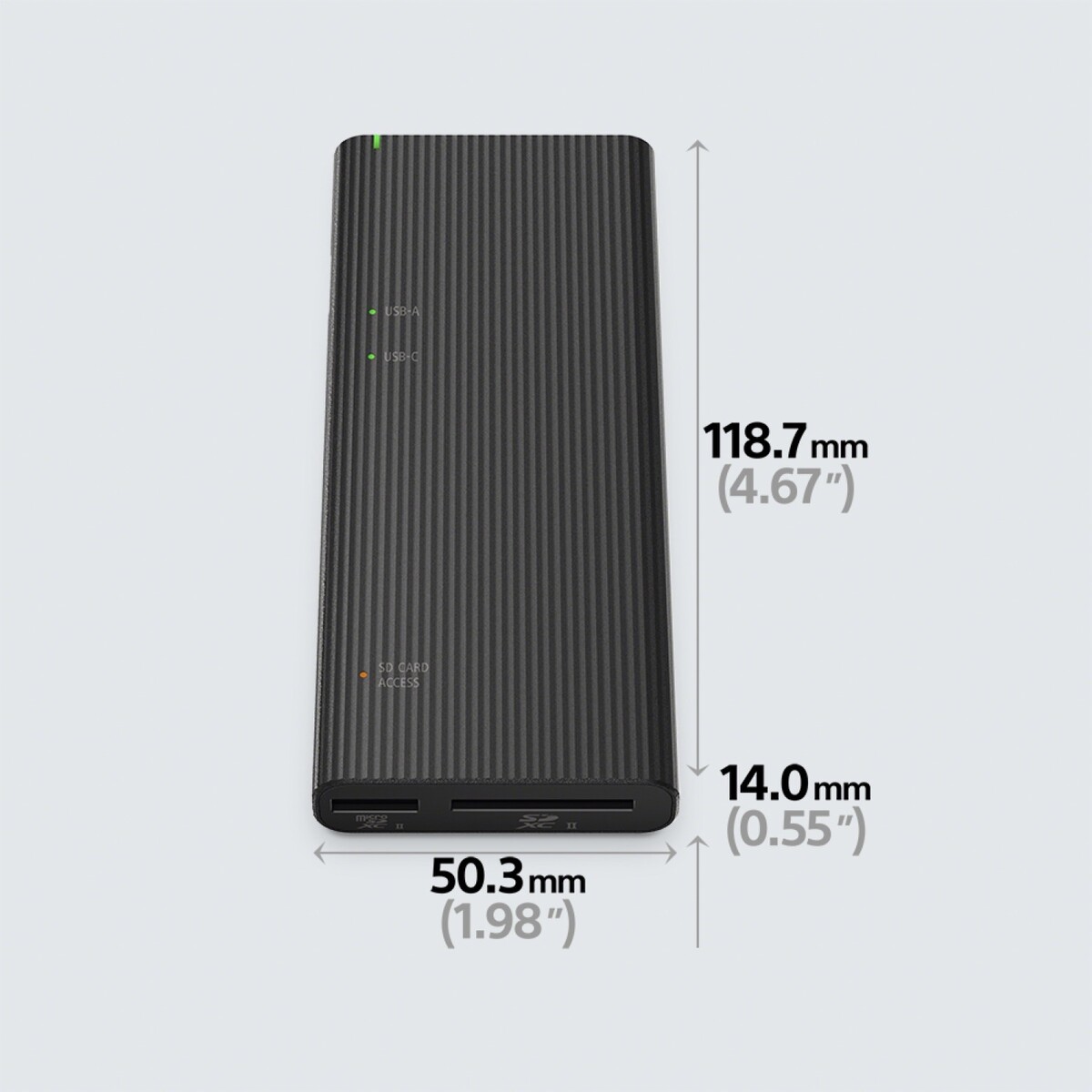 Beide USB-Ports unterstützen USB 3.1 Gen 2. Sony behauptet, mit Datenübertragungsraten von bis zu 1.000 MB/s über den Typ-C-Port sei der Hub der Schnellste am Markt. Dazu kommen SD- und microSD-Kartenleser, beide mit Support für schnelle UHS-II-Speicherkarten. Bildschirme lassen sich über den HDMI-Port anschließen, wobei 4k-Displays mit bis zu 30 Bildern pro Sekunde unterstützt werden.