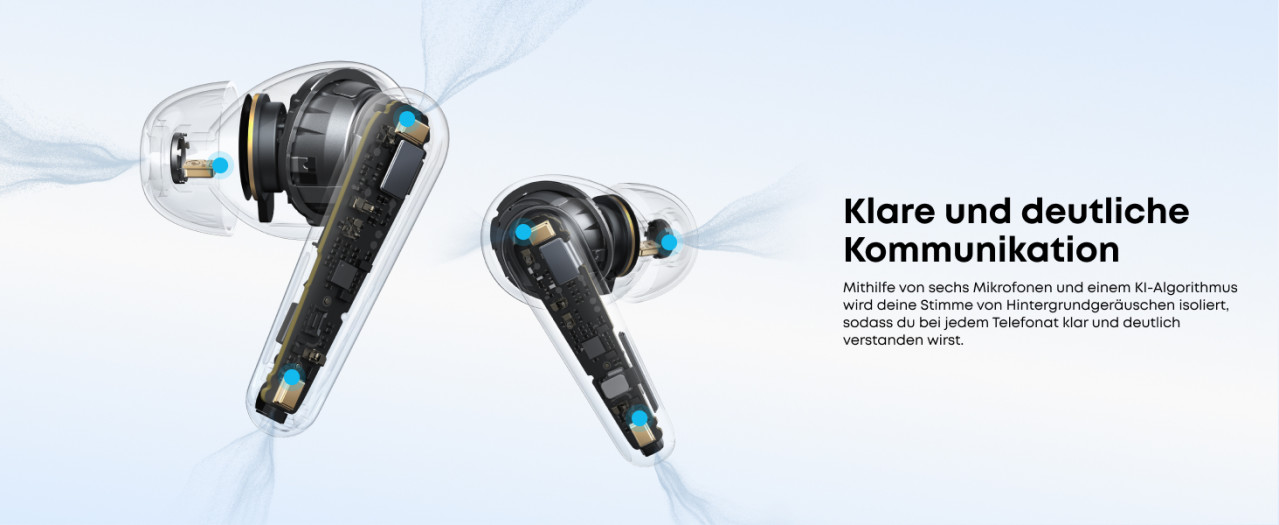 Zum Einsatz kommen 9,2 Millimeter große Treiber, wobei es sich um Wollpapier-Membranen handeln soll. Beworben wird das Vorhandensein von zwei den Bass verstärkenden Akustikröhren. Die aktive Geräuschunterdrückung unterstützt einen Transparenzmodus, damit lässt sich die Umgebung weiter wahrnehmen. Durch die IP55-Zertifizierung sollten die Soundcore Liberty 5 weder durch Wasser noch Staub schnell beschädigt werden.