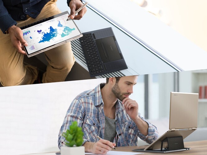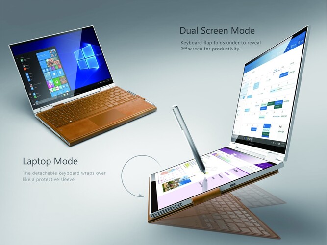 Hierbei wird ein Dual-Display-Laptop mit Ständer einfach zum Dual-Display-Desktop, dessen zweites Display sogar perfekt in Augenhöhe positioniert wäre - die abgesetzte Tastatur entspricht einer klassischen Laptop-Tastatur, und kann auch abgesetzt genutzt werden. Eine etwas einfachere Variante ohne den Ständer wäre dann das Duo360, welches wohl noch am ehesten dem Surface Neo von Microsoft ähnelt, hier mit andockbarem Tastaturcover, welches das Gerät entweder, direkt auf einer Displayhälfte liegend, zum klassischen Notebook macht, oder als Schutzhülle für den transportablen Dual-Display-PC genutzt werden kann.