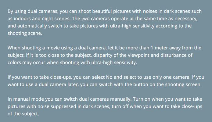 Die japanische Tech-Seite Androplus.org berichtet weiters, dass der Name "Fusion" in einigen Dateinamen der Firmware zu finden ist, auch die erhöhte ISO-Sensitivität bis zu 51200 bei Photos findet Erwähnung. Der obige Text wird als Warnhinweis eingeblendet, wenn die Dual-Cam erstmals gestartet wird. Daraus geht hervor, dass der zusätzliche Low-Light-Sensor im Pro-Modus auch manuell ein- oder ausgeschaltet werden kann, letzteres empfiehlt Sony in dunklen Umgebungen. Bei Close-Ups näher als 1 Meter empfiehlt sich allerdings das Abschalten der Funktion, da es sonst zu Bildstörungen kommen könnte. Im Auto-Modus können beide Sensoren parallel arbeiten und je nach erkannter Szenerie hochwertige Low-Light-Aufnahmen erstellen, schreibt Sony.