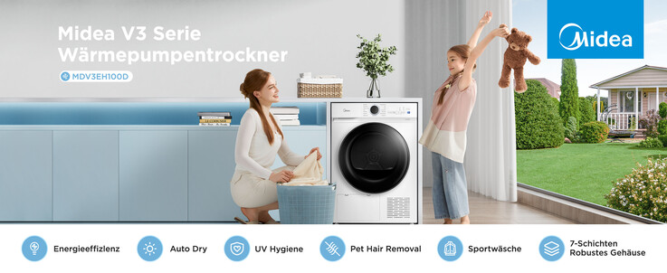 Der passende Partner zur Midea V3 Waschmaschine ist der Wärmepumpentrockner aus der gleichen Produktreihe. Dieses Gerät mit der Modellnummer MDV3EH100D lässt sich bei Amazon für nur 499,99 Euro bestellen und wartet ebenfalls mit vielen nützlichen Eigenschaften auf.