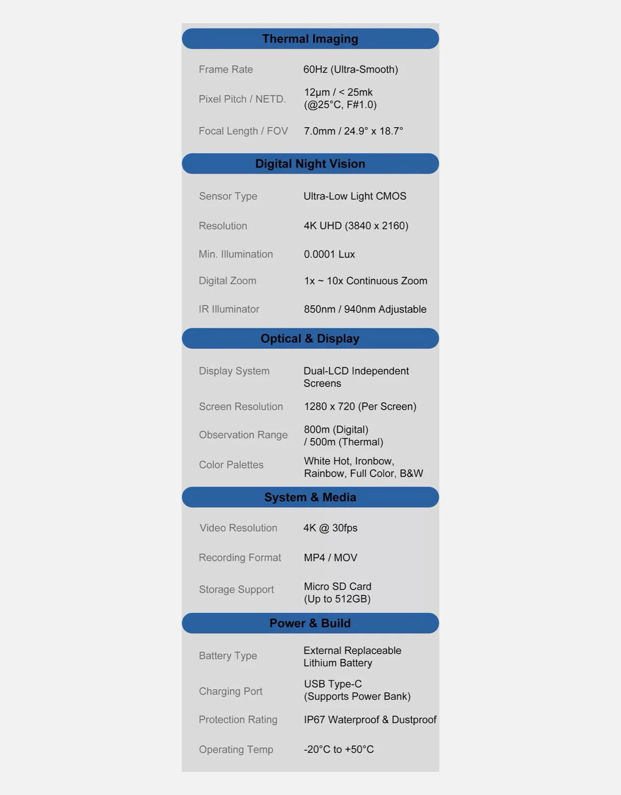Der Hersteller bewirbt zehnfachen Zoom, mangels Angabe ist allerdings davon auszugehen, dass es sich dabei um digitalen Zoom handelt, der sich negativ auf die Bildqualität auswirkt. SpectraEyes besitzt zusätzlich eine Wärmebildkamera, die 60 Bilder pro Sekunde aufzeichnen kann, allerdings fehlt eine Angabe zur Auflösung dieser Kamera. Der Akku soll eine Laufzeit von vier bis fünf Stunden bei Nutzung der Nachtsichtkamera, oder zwei Stunden bei Verwendung beider Kameras ermöglichen. Zwei Displays mit einer Auflösung von jeweils 1.280 x 720 Pixel zeigen die Videos beider Kameras zeitgleich an.