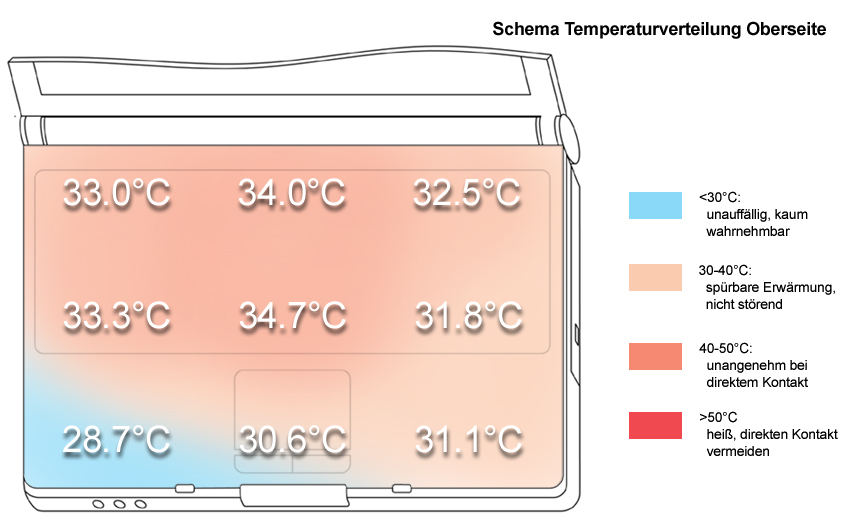 Notebookcheck: "Überraschend gering fiel im Test sowohl die Lautstärke als auch die Oberflächentemperatur des Gerätes aus."
