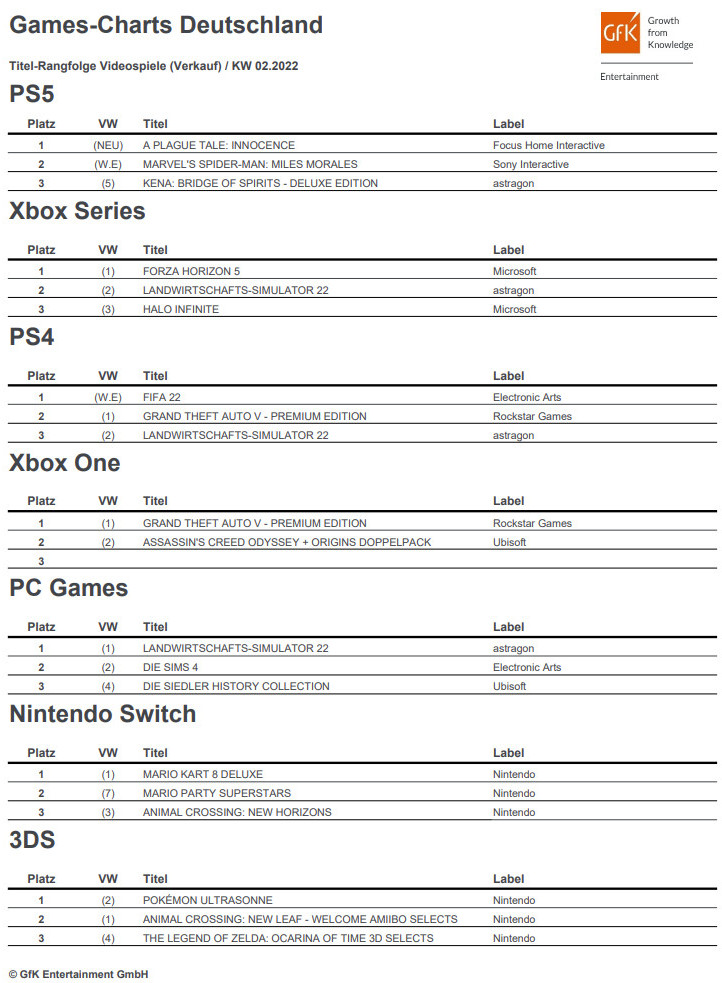Die Verkaufs-Awards für die meisverkauften Computer- und Videospiele haben wir abgehakt. Die Top 20 der populärsten Games 2021 ebenfalls. Und dass FIFA 22 trotz viel Ärger unter den Spielern die Games-Jahrescharts 2021 dominiert, ist ebenfalls durch. Mit den Games-Charts der Kalenderwoche 2, ermittelt von der GfK Entertainment, vervollständigen wir den Überblick über die derzeit beliebtesten Spiele für Computer und Spielkonsolen.