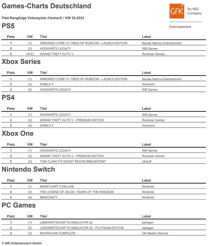 Der Third-Person-Shooter ballert Diablo 4 (jetzt Platz 2) vom Xbox-Series-Thron und lässt auch den Zauberlehrlingen des Harry-Potter-Abenteuers Hogwarts Legacy (Rang 2) auf der PlayStation 5 keine Chance. Nach einem Strohfeuer in KW 34 auf Platz 3 der PS5-Charts muss der Magie-Shooter Immortals of Aveum in der Folgewoche wieder GTA 5 (3) Platz machen.