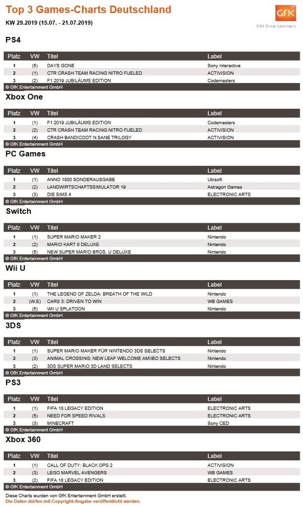 Auf der PlayStation 4 schiebt sich Days Gone als packende Endzeit-Action wieder auf Platz 1, auf der Xbox One bleibt F1 2019 in der Jubiläums-Edition weiter auf dem Thron. Anno 1800 dominiert bei den PC-Spielern weiter in der Gunst und verteidigt Position 1 vor dem Landwirtschafts-Simulator 19 und den Sims 4.