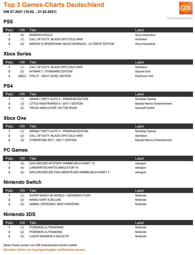 In den wöchentlichen Games-Charts performte "Demon's Souls" (bei Amazon für PlayStation 5 zu 65,06 €) höllisch gut und holte sich auf der PS5 die Spiele-Krone von "Call Of Duty: Black Ops Cold War", das jetzt auf Rang 2 Stellung bezogen hat. Auf Position 3 schiebt sich "Marvel's Spider-Man: Miles Morales" in der Ultimate Edition. Auf der zweiten Superkonsole, der Xbox Series X/S, bleibt die Doppelspitze aus "Call of Duty: Black Ops Cold War" und "Hitman 3" Standard Edition weiter ungeschlagen, allerdings stürmt auf Platz 3 die "FIFA 21 - Next Level Edition" (bei Amazon für Xbox Series X/S 68,05 €) heran.