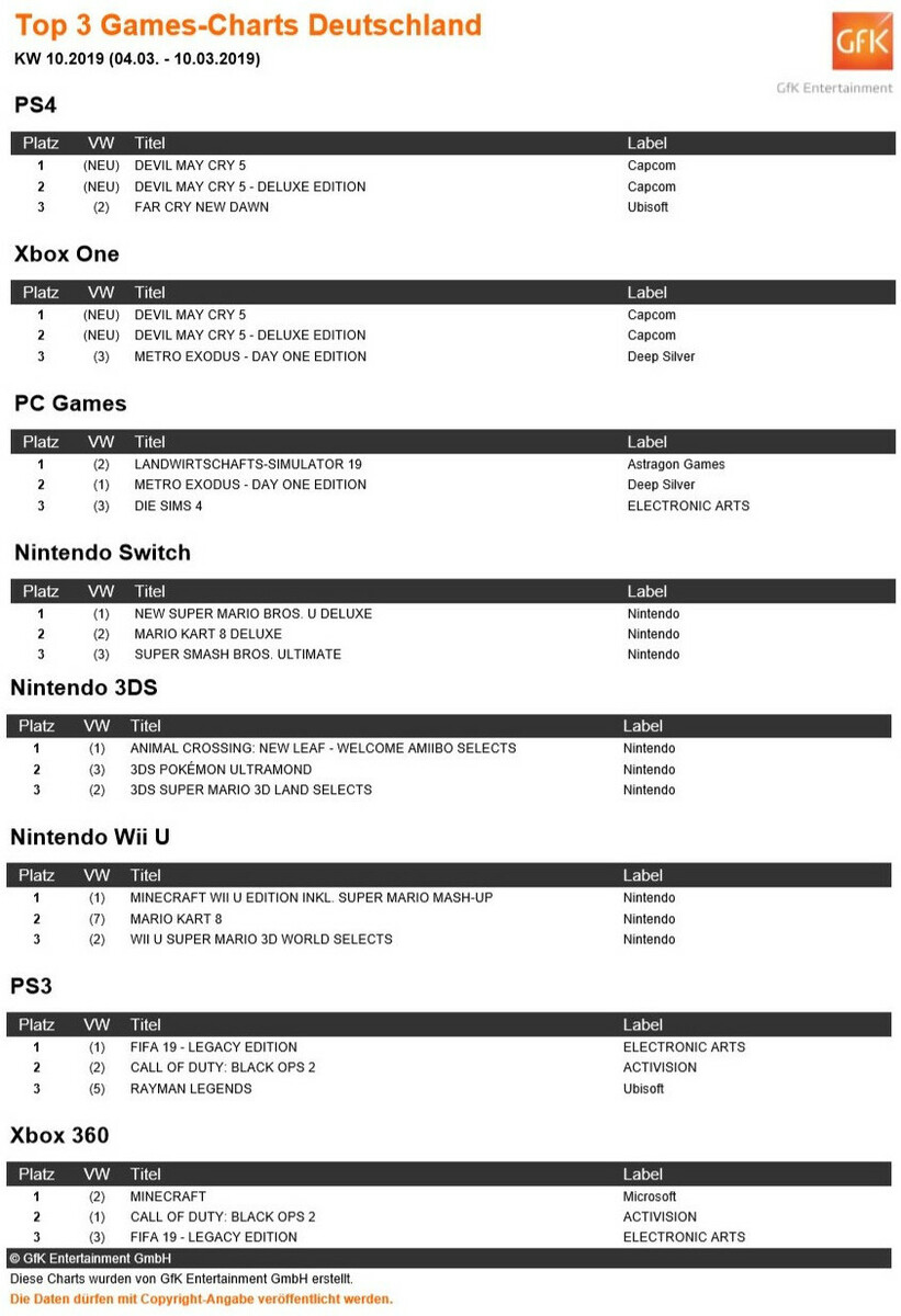 Im PC-Ranking gelingt Devil May Cry 5 der Einstieg auf Platz 7. Ganz oben auf dem Treppchen tuckert wieder der Landwirtschafts-Simulator 19 über die Felder. Metro Exodus holt Rang 2. Einziger weiterer Neuzugang: Das Bastelabenteuer Kirby und das extra magische Garn gelingt die Platzierung an vierter Stelle der 3DS-Charts. Meistverkaufter Titel bleibt hier Animal Crossing: New Leaf - Welcome Amiibo Selects.
