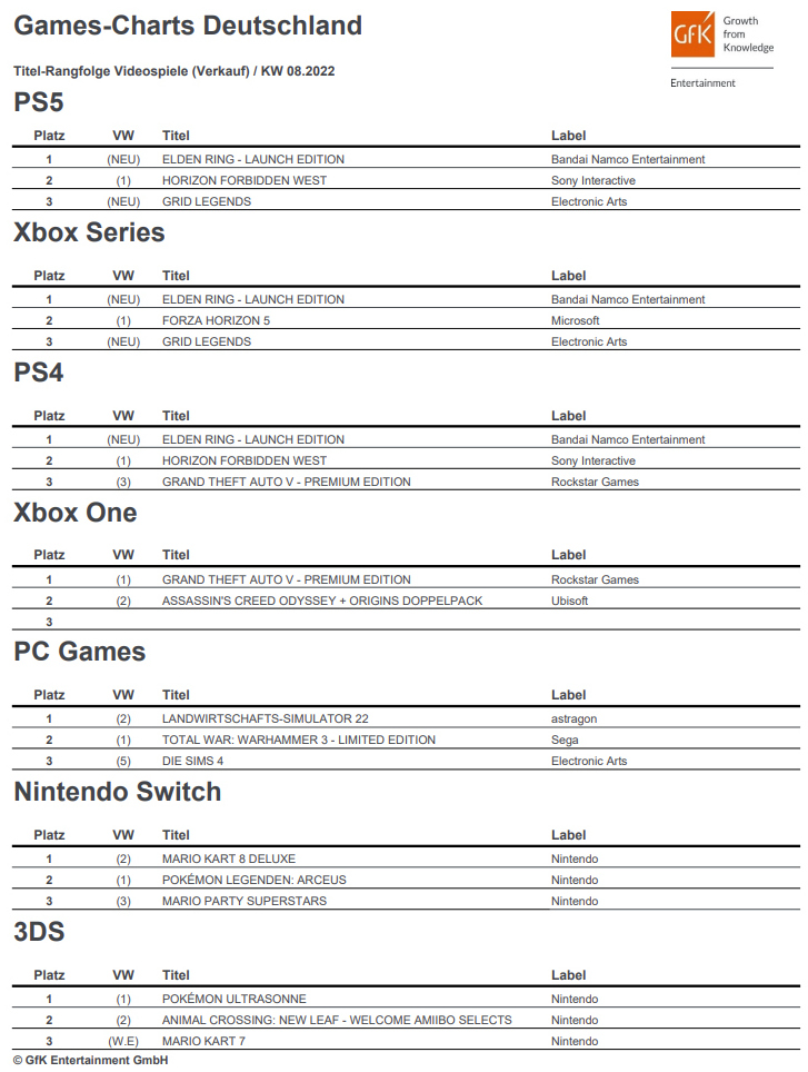 Das tut den Verkaufszahlen von Grid Legends in Deutschland allerdings keinen Abbruch. Grid Legends holt auf der PlayStation 5 und Xbox Series X/S jeweils den dritten Platz in den Top-Charts der Computer- und Konsolenspiele. Elden Ring schnappt sich in der Launch-Edition des Open-World-RPGs im PS5- und Xbox Series-Ranking als auch in der PS4-Hitliste jeweils die Spitzenposition in den Spielecharts.