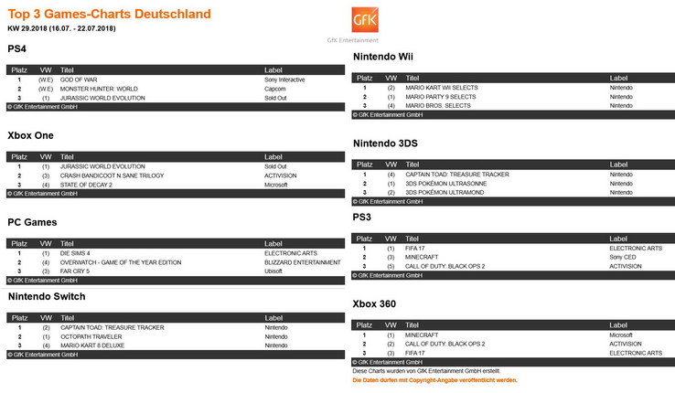 In den Top 3 der offiziellen Spielecharts auf PS3, Xbox One, Xbox 360, PC, Nintendo Switch, der Wii und Nintendo 3DS gab es in KW 29 nur etwas Gerangel auf den Plätzen eins bis fünf. Hier und da wurde beispielsweise von Mario etwas geschoben und Captain Toad: Treasure Tracker rauschte auf Nintendo 3DS ganz nach oben auf die Eins.