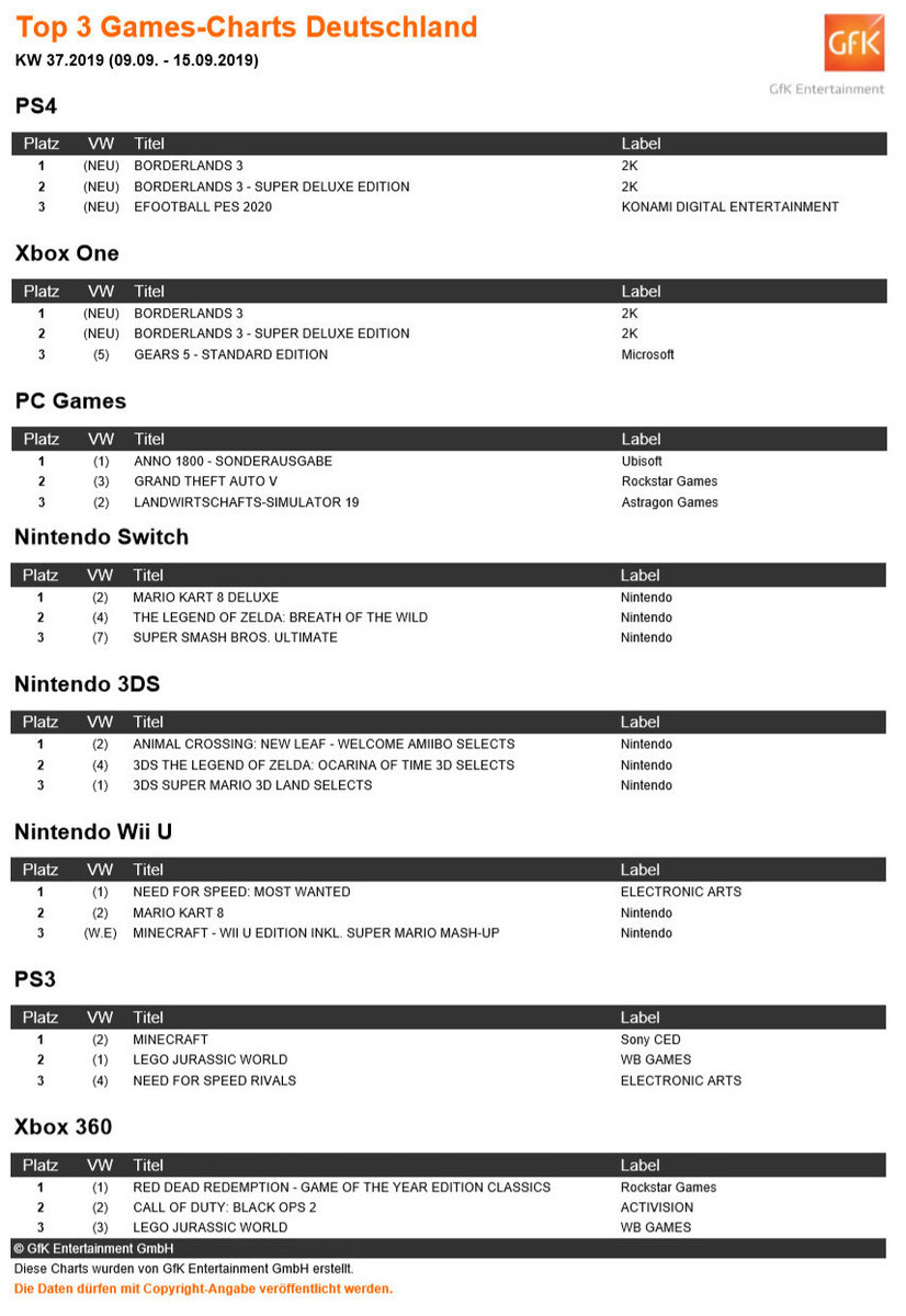 Dank einem harten Nerf gibt es ab sofort für Borderlands 3-Vielspieler deutlich weniger Loot im Mayhem-Modus. Ungeachtet des neuesten Hotfixes steigt "Borderlands 3" mit Abstand am höchsten in den offiziell von GfK Entertainment ermittelten Spielecharts der Kalenderwoche 37 ein. Der Loot-Shooter von Gearbox Software und 2K generierte über ein Drittel aller Umsätze im physischen Video- bzw. Computerspielemarkt. Damit ballert sich Borderlands 3 locker den Thron des PS4- und Xbox One-Rankings frei. Zudem schnappt sich das bunte Actionspiel auch die Positionen zwei (Super Deluxe Edition) und acht (Deluxe Edition) der beiden Konsolen-Hitlisten.