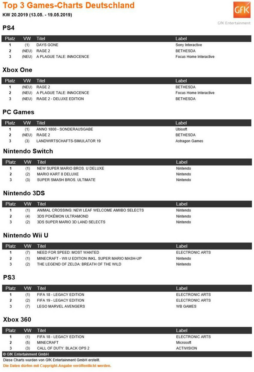 Position 2 der Xbox One-Auswertung sowie Rang 3 der PS4-Hitliste ging in KW 20 an das Action-Adventure A Plague Tale: Innocence, das im pestverseuchten Frankreich des 14. Jahrhunderts spielt und zwei Waisenkinder auf ihrer Flucht vor der Inquisition begleitet. Am aktuellen Dauerbrenner Days Gone auf der PlayStation 4 kommen die beiden Spiele allerdings nicht vorbei. Das meistverkaufte Computerspiel ist einmal mehr Anno 1800.