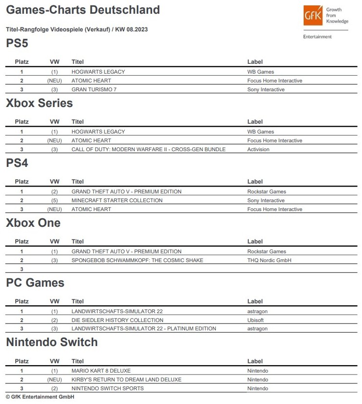 Spitzenreiter bleibt auf PlayStation 5 und Xbox Series X/S jeweils Hogwarts Legacy. Im PS4-Ranking holt Atomic Heart hinter GTA V und Minecraft die Bronzemedaille. Den dritten Rang belegen auf PS5 die Rennsimulation Gran Turismo 7 sowie der Ego-Shooter Call of Duty: Modern Warfare 2 als Cross-Gen Bundle auf Xbox Series.