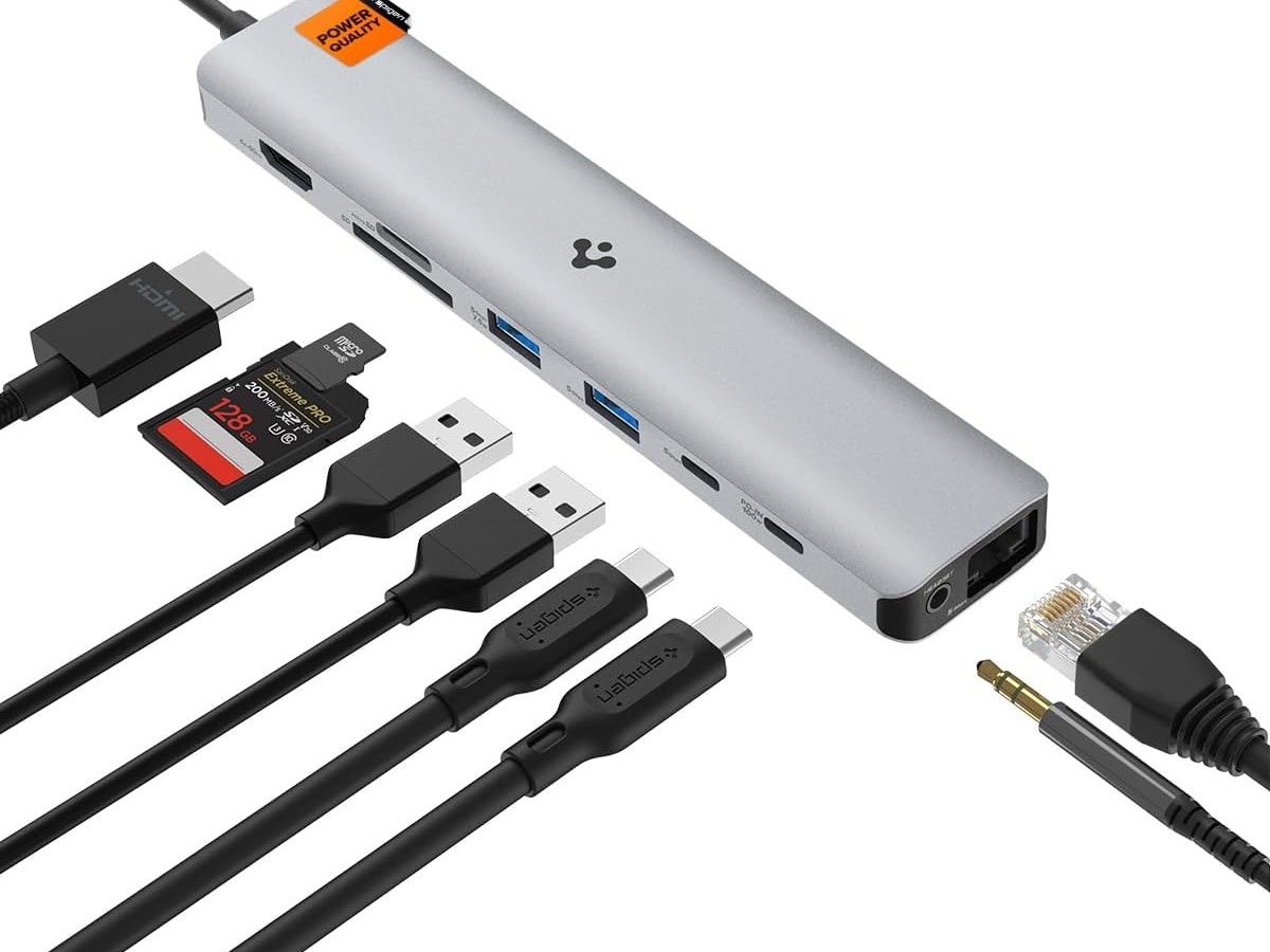 Angebunden an ein Netzwerk können Geräte über das Spigen ArcDock 9-in-1-Dock mithilfe von Gigabit-Ethernet werden. Eine Klinkenbuchse steht bereit. Der HDMI-Ausgang soll auch die Bildausgabe von 4K-Material mit 60 Hz unterstützen. Für das 9-in-1-Dock wird ein Preis von knapp 80 Euro aufgerufen, dabei wird aktuell noch ein 20-Prozent-Gutschein offeriert.
