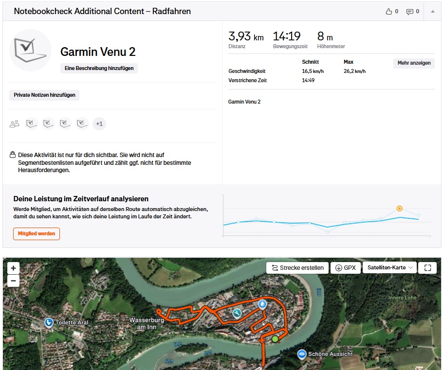 Sowohl in engen Altstadtgassen als auch in weniger dicht bebauten Gebieten hält es praktisch konstant die Ideallinie und ist alles in allem fast so genau wie das Vergleichsgerät, die Fitness-Smartwatch Garmin Venu 2.