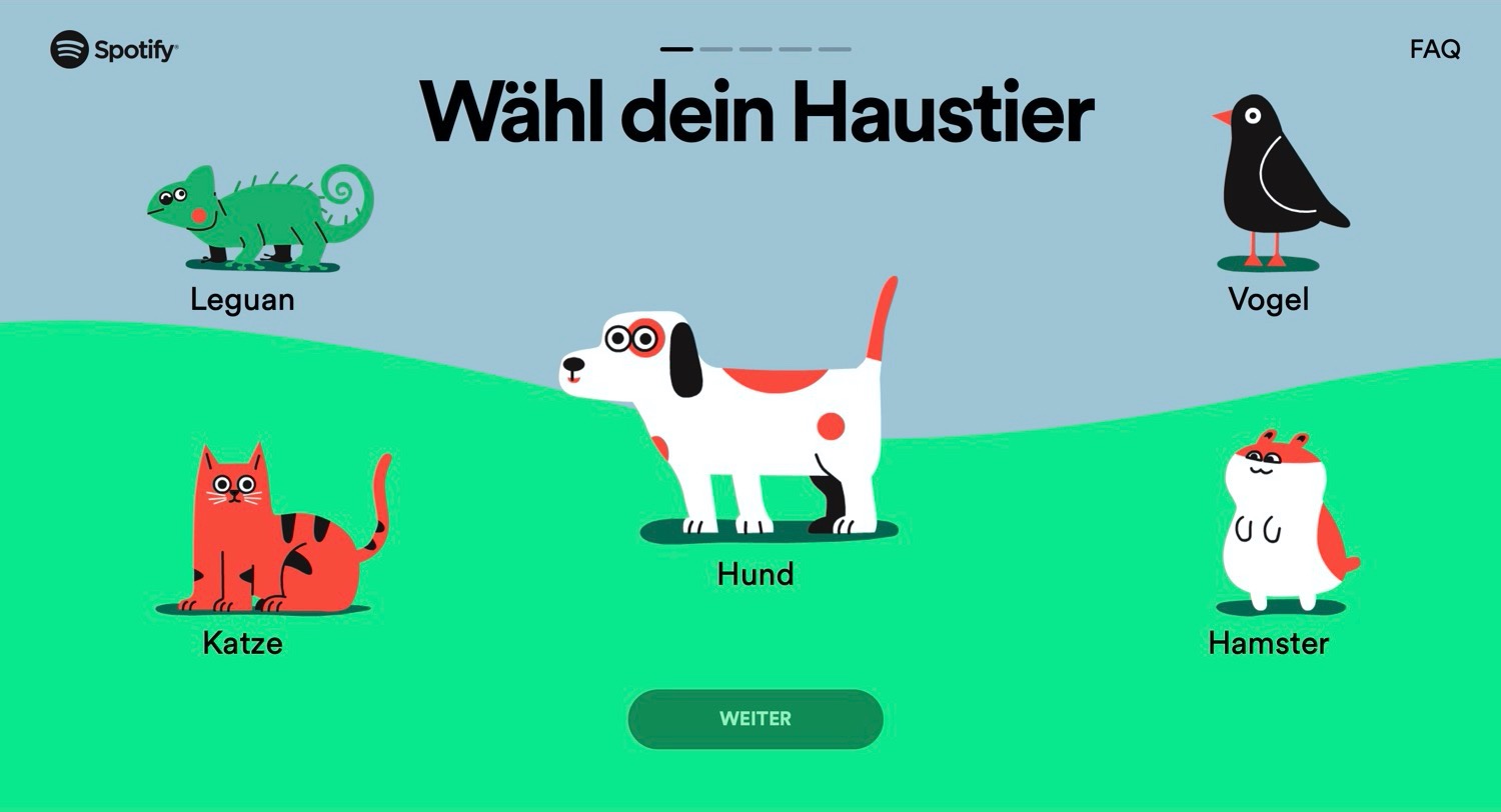 Über die Spotify Pets-Webseite kommt man in wenigen Schritten zur perfekten Playlist für seinen treuen Gefährten. Dabei muss man lediglich auswählen, welches Haustier man besitzt (und ja, viele Reptilien und Insekten werden immer noch benachteiligt), sowie einige Fragen zur Persönlichkeit beantworten, etwa ob sein Haustier eher ruhig oder energiegeladen ist – durch Schieberegler lassen sich die Antworten sogar fast stufenlos als Tendenz angeben.
