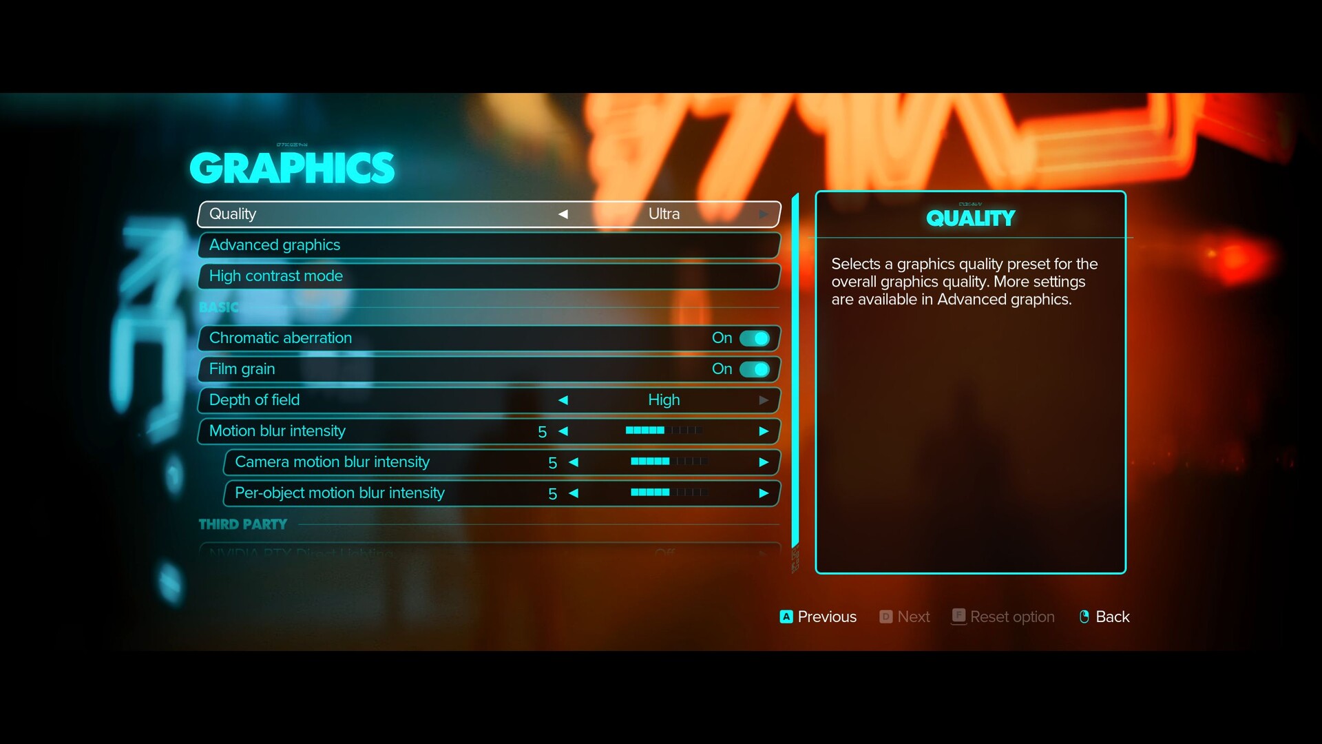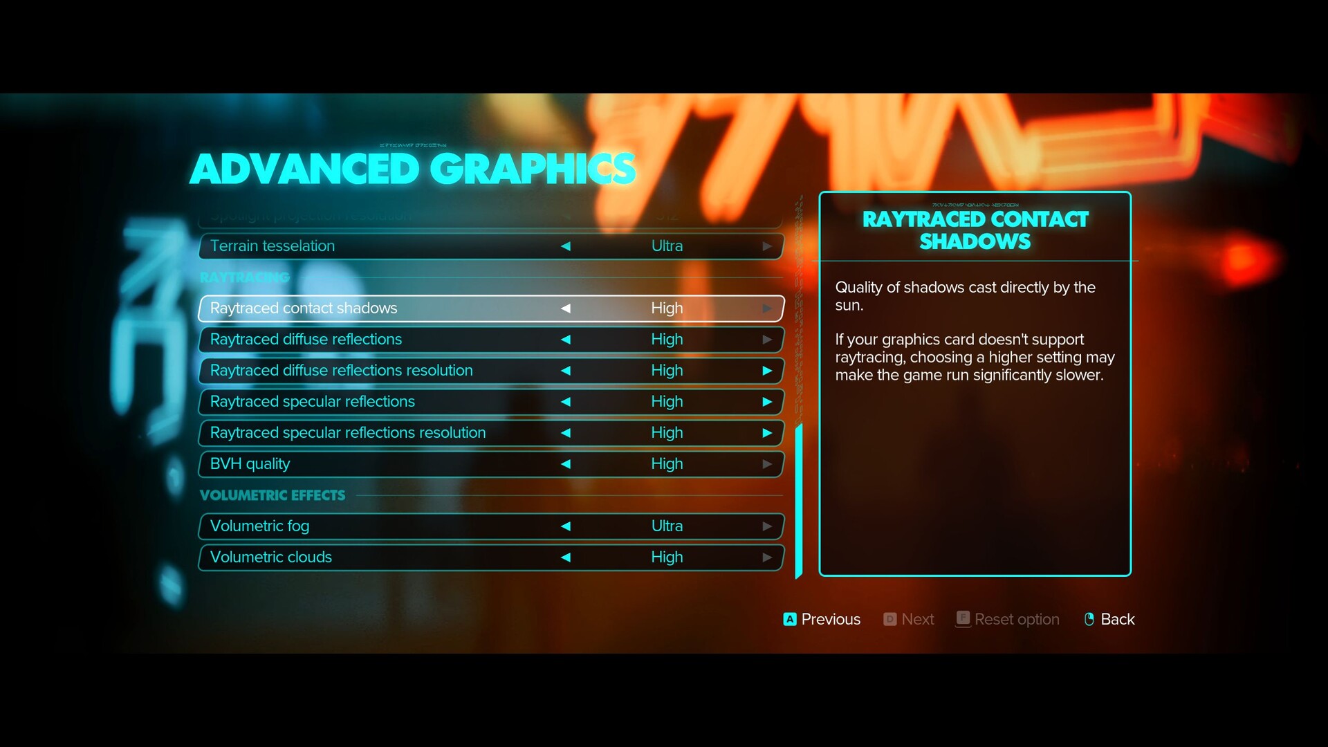 Noch mehr Optionen hält der Graphics-Reiter oder besser gesagt das Untermenü Advanced Graphics parat. Hier tummeln sich über 20 Einzeloptionen inklusive mehrerer Raytracing-Settings. Die happigen Systemanforderungen ergeben sich unter anderem dadurch, dass Raytracing auf jeder Stufe – es existieren insgesamt vier Presets (Low bis Ultra) – automatisch aktiviert ist.