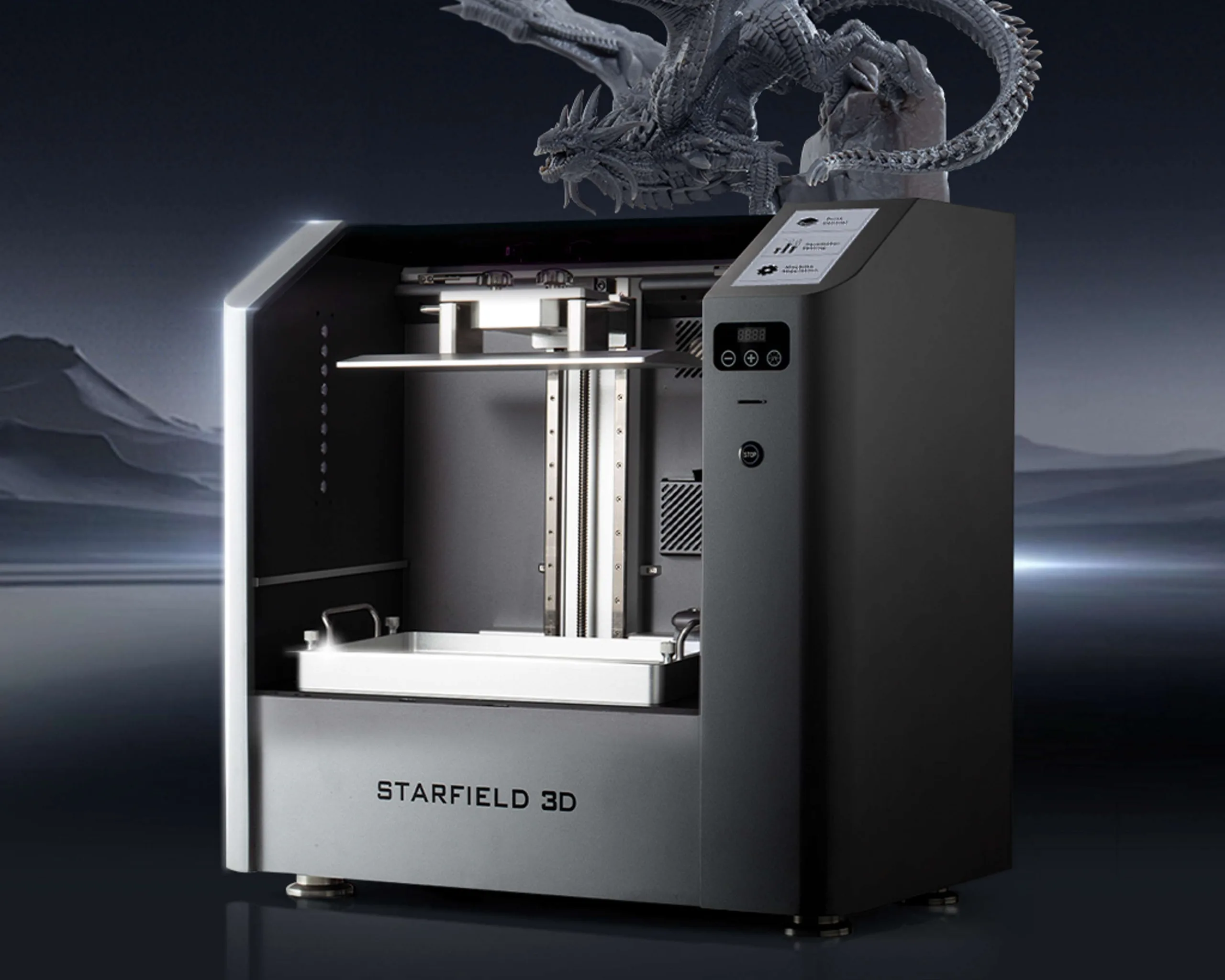 Der Starfield 3D ist ein neuer 3D-Drucker mit einer umfangreichen Ausstattung. Grundsätzlich handelt es sich um einen SLA-Drucker. Ein solcher erzeugt den 3D-Druck durch die selektive Aushärtung eines fotosensitiven Harzes. Dabei wird beim Starfield 3D kein LCD-Display genutzt, sondern ein Laser. Das 720 x 450 x 700 Millimeter große System bringt dabei stolze 58 Kilogramm auf die Waage. Beworben wird mit einer Auflösung von 25 µm, die Schichtdicke wird auf zwischen 0,025 und 0,15 Millimeter beziffert. Angefertigt werden können bis zu 350 x 350 x 240 Millimeter große Drucke.