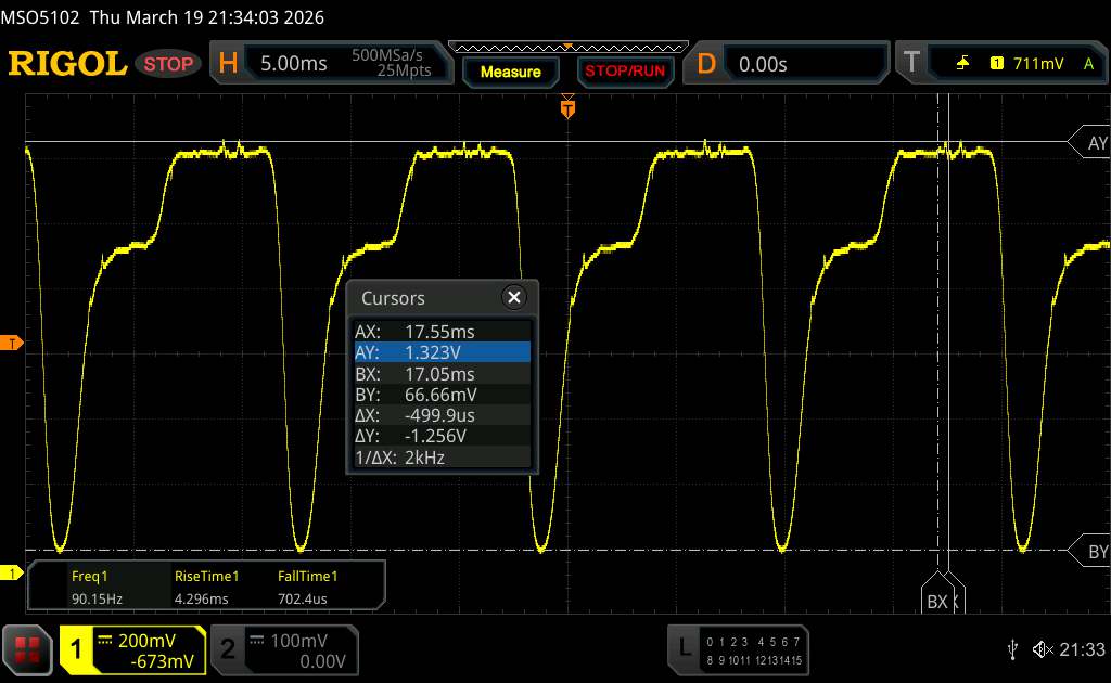 | Flackern / PWM festgestellt | 90 Hz Amplitude: 17.24 % Secondary Frequency: 2000 Hz | ||