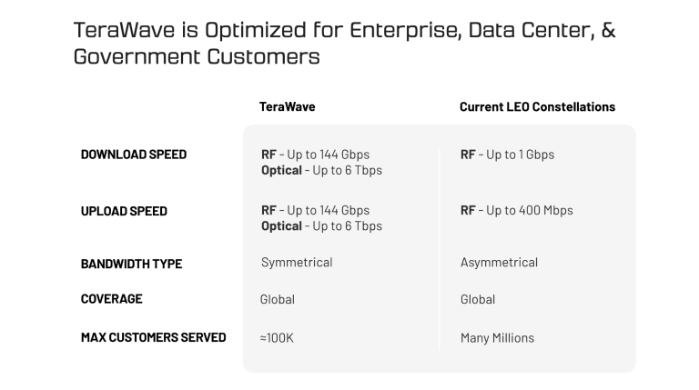 TeraWave setzt auf eine Multi-Orbit-Konstellation aus 5.408 Satelliten, die über die niedrige (LEO) und mittlere Erdumlaufbahn (MEO) verteilt sind. Die meisten Satelliten operieren im LEO und verbinden sich über Funkverbindungen mit Bodenstationen, die laut Blue Origin Geschwindigkeiten von bis zu 144 Gbit/s erreichen können. Eine kleinere Gruppe von 128 Satelliten im MEO fungiert als Hochkapazitäts-Backbone und nutzt optische Verbindungen, um Daten im Terabit-Bereich zwischen den Satelliten und der Bodeninfrastruktur zu übertragen.