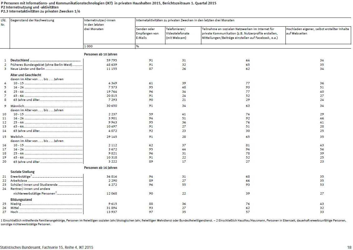 Demnach haben im ersten Quartal des vergangenen Jahres 31 Prozent der über zehn Jahre alten privaten Internetnutzerinnen und -nutzer in Deutschland über das Internet telefoniert oder führten über das Internet Videotelefonate (Telefonate mit Webcam). Dies teilte das Statistische Bundesamt mit. Gezählt wurden dabei sowohl herkömmliche Telefonate, wie beispielsweise über Voice over IP (VoIP), als auch Videotelefonate mittels einer Webcam.