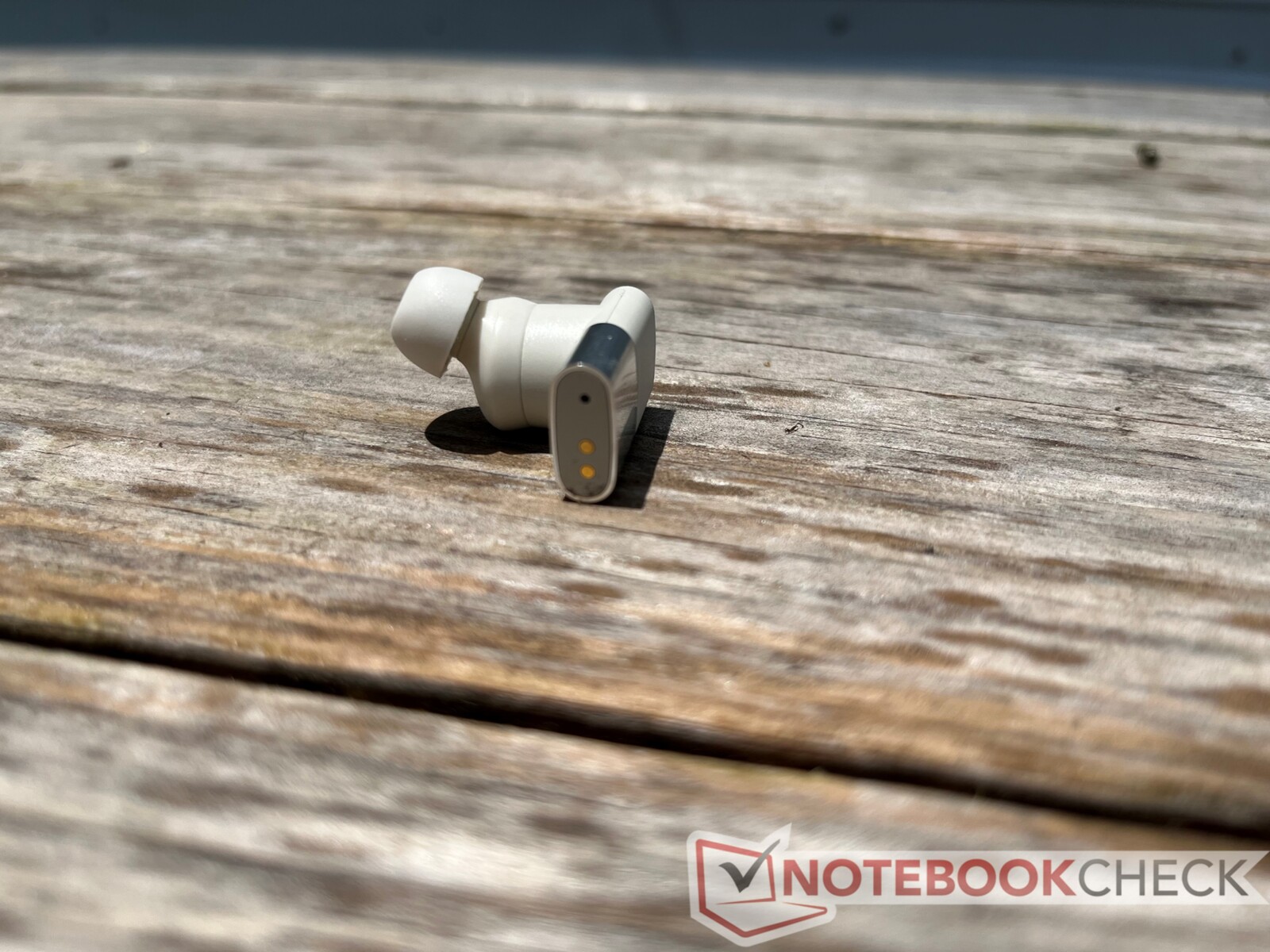 Nichtsdestotrotz gibt es auch einige Schattenseiten: Beispielsweise erkennen die Earbuds durch den fehlenden IR-Sensor nicht, ob sie sich nun im Ohr befinden oder nicht. So kommt es auch vor, dass die Musik weiterläuft, wenn ein Kopfhörer aus dem Ohr genommen wird. Dies kann unserer Meinung nach auf Dauer ziemlich nervig sein (wenn man bedenkt, dass andere Modelle dieser Preisklasse dieses Feature besitzen). Der Audio-Passthrough ist unterdurchschnittlich, was vor allem an einem relativ nervigen Rauschen, welches andauernd zu hören ist, liegt. Weiters sind die InEars ziemlich dick. Dies sorgt zwar für eine ziemlich lange Akkulaufzeit und ein volleres Klangbild, sieht jedoch von außen betrachtet etwas komisch aus, da sie sehr gut sichtbar aus dem Ohr stehen.