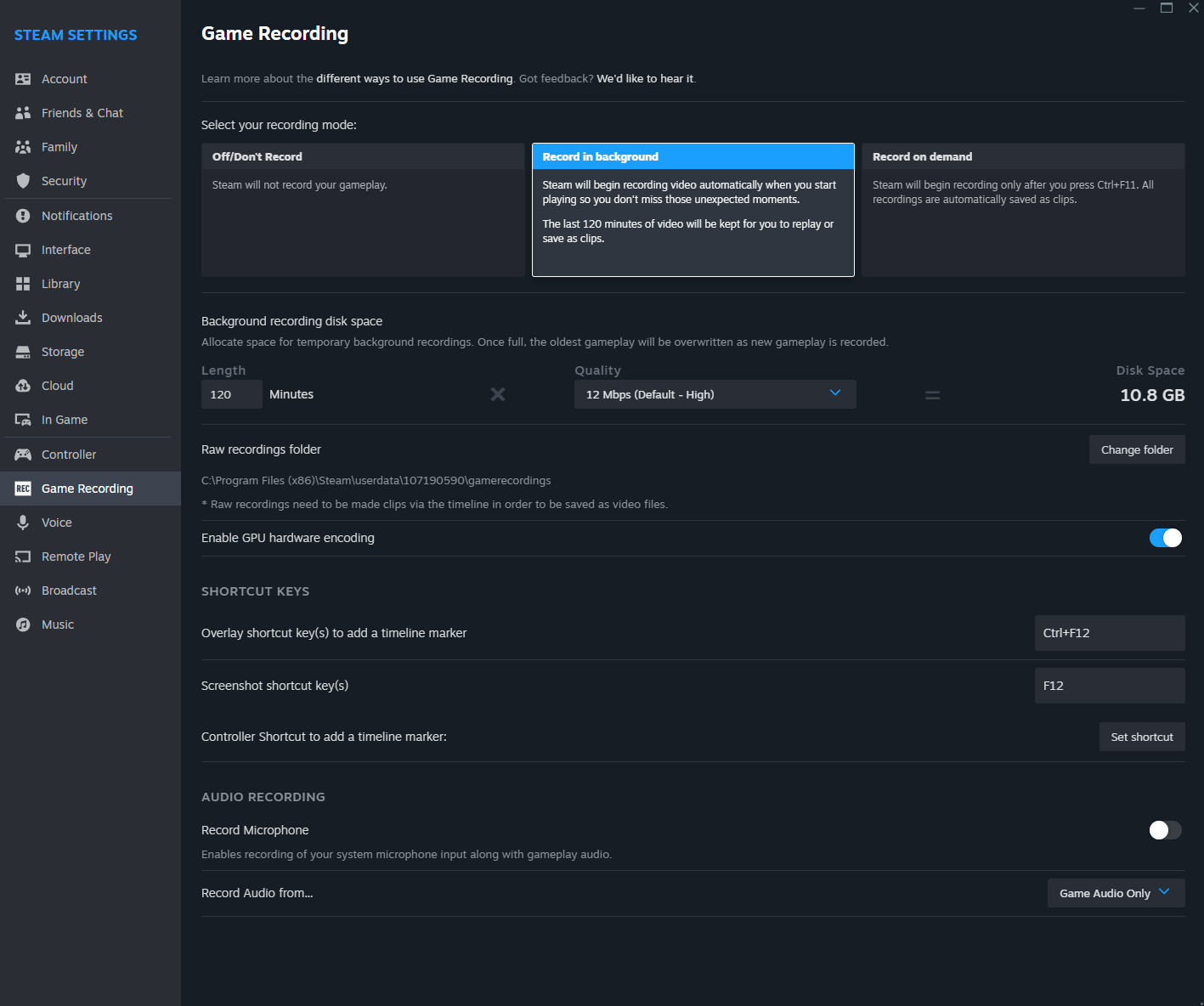 Standardmäßig ist die Aufzeichnungsfunktion in Steam deaktiviert. Um sie zu aktivieren, geht man zu den Einstellungen, wo es einen neuen Reiter "Game Recording" gibt. Von hier aus kann zwischen Hintergrundaufnahme und Aufnahme bei Bedarf gewählt, indem Sie Strg+F11 drücken. Bei der Hintergrundaufnahme wird, wie der Name schon sagt, alles, was Sie spielen, automatisch aufgenommen, bis die Aufnahme eine bestimmte Größe auf Ihrer Festplatte erreicht hat.