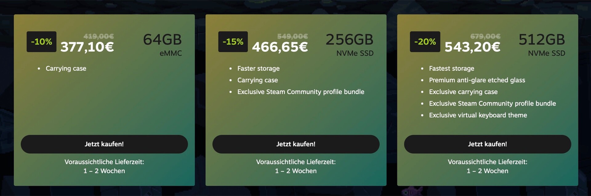 Das Basismodell mit 64 GB eMMC-Speicher wird mit 10 Prozent Rabatt angeboten, also für 377,10 Euro statt 419 Euro. Die mittlere Konfiguration mit einer 256 GB NVMe SSD kostet mit 15 Prozent Rabatt nur 466,65 Euro statt 549 Euro. Das Topmodell, das neben einer 512 GB SSD und einer minimal hochwertigeren Transporttasche auch ein mattes Display besitzt, kann im Summer Sale mit 20 Prozent Rabatt für 543,20 Euro statt 679 Euro bestellt werden. Da das Steam Deck offiziell nur direkt über Steam vertrieben wird, erübrigt sich ein Preisvergleich.