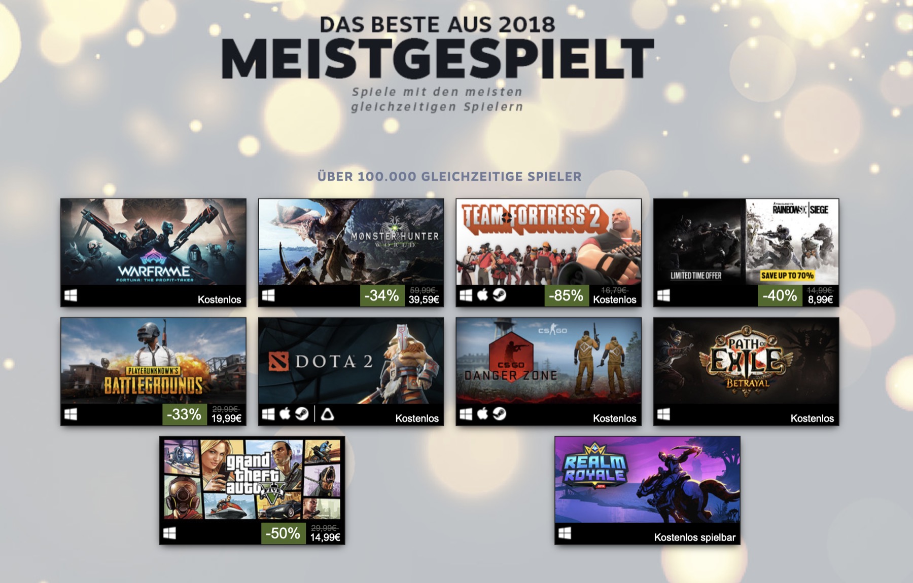 Steam konnte 2018 bei insgesamt zehn Spielen mehr als 100.000 gleichzeitige Spieler messen: